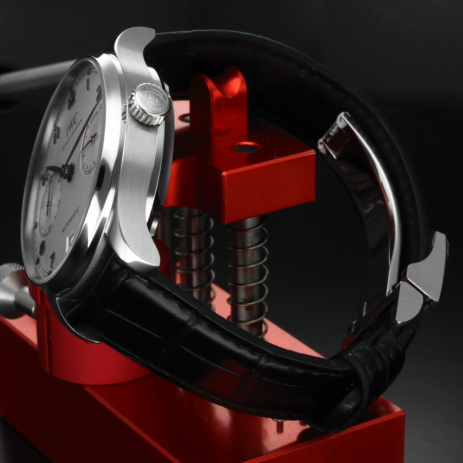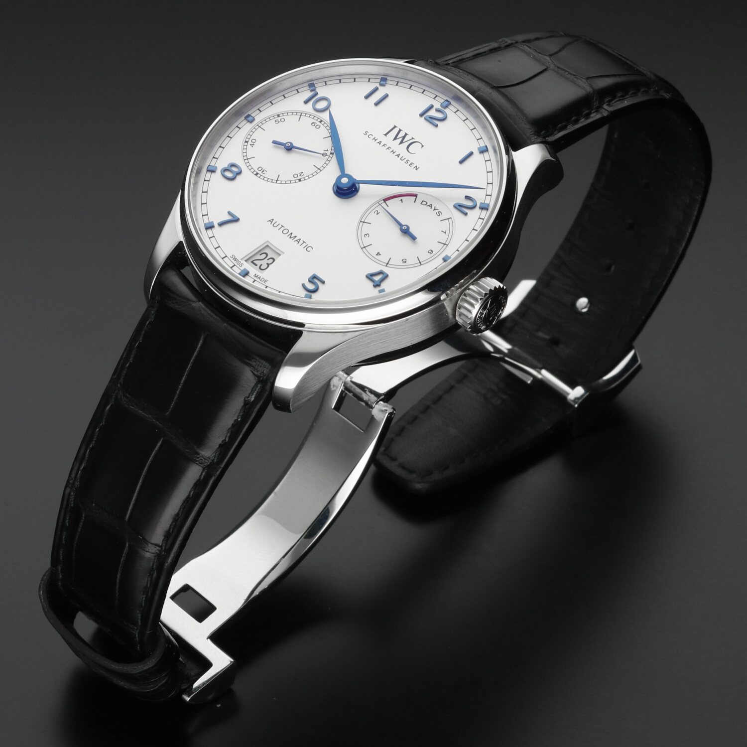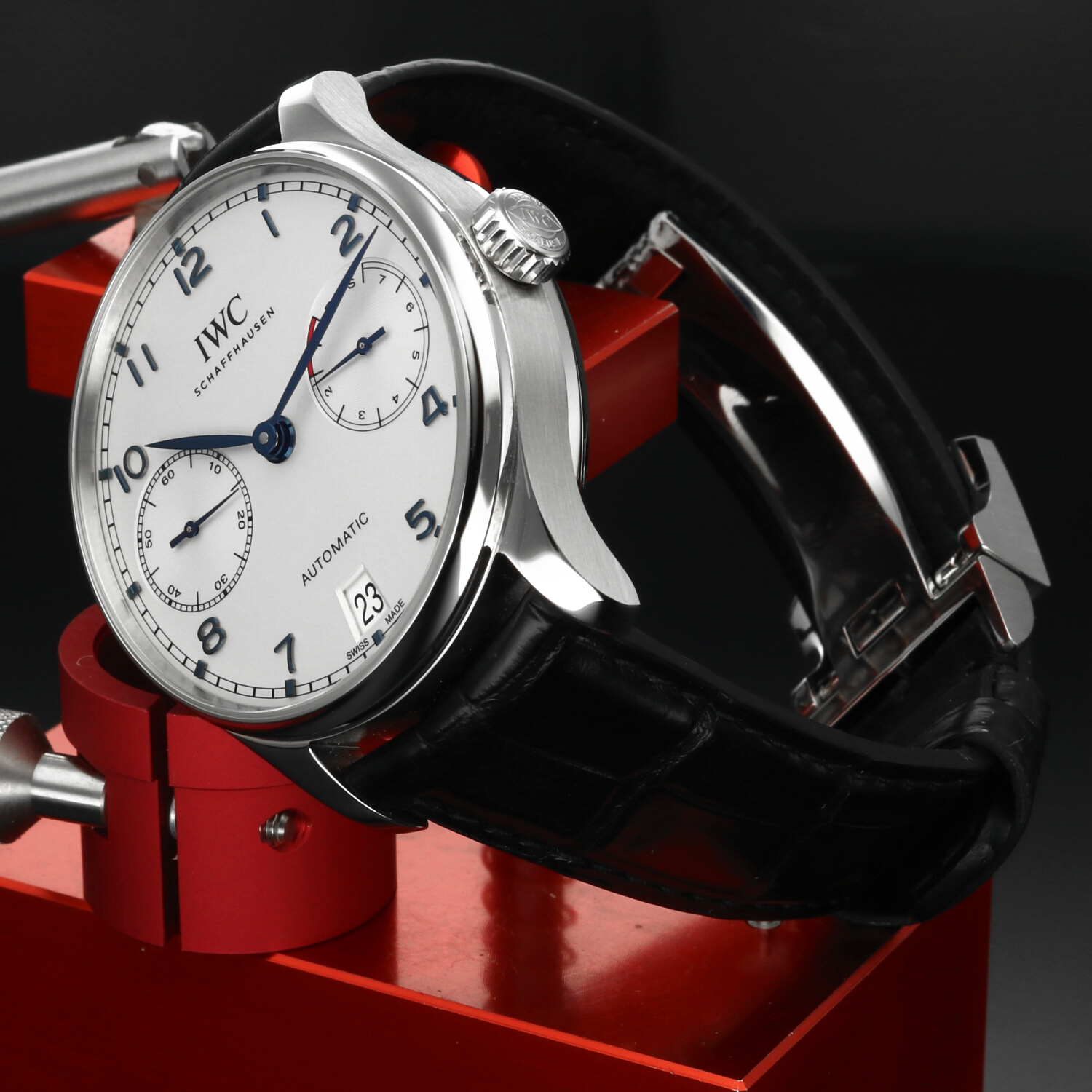 General Overview: From the very first glance, the IWC Portugieser Automatic 7 Days gives the impression of a watch that has just come out of the boutique. The overall look is clean, bright and exceptionally fresh—something rarely encountered in a pre-owned timepiece. Only under close inspection can one notice a few minimal traces consistent with extremely careful handling, yet the overall aesthetic is remarkably coherent and exceptionally well preserved. It is an example that immediately captures the eye and invites the wearer to discover the outstanding condition that defines it.