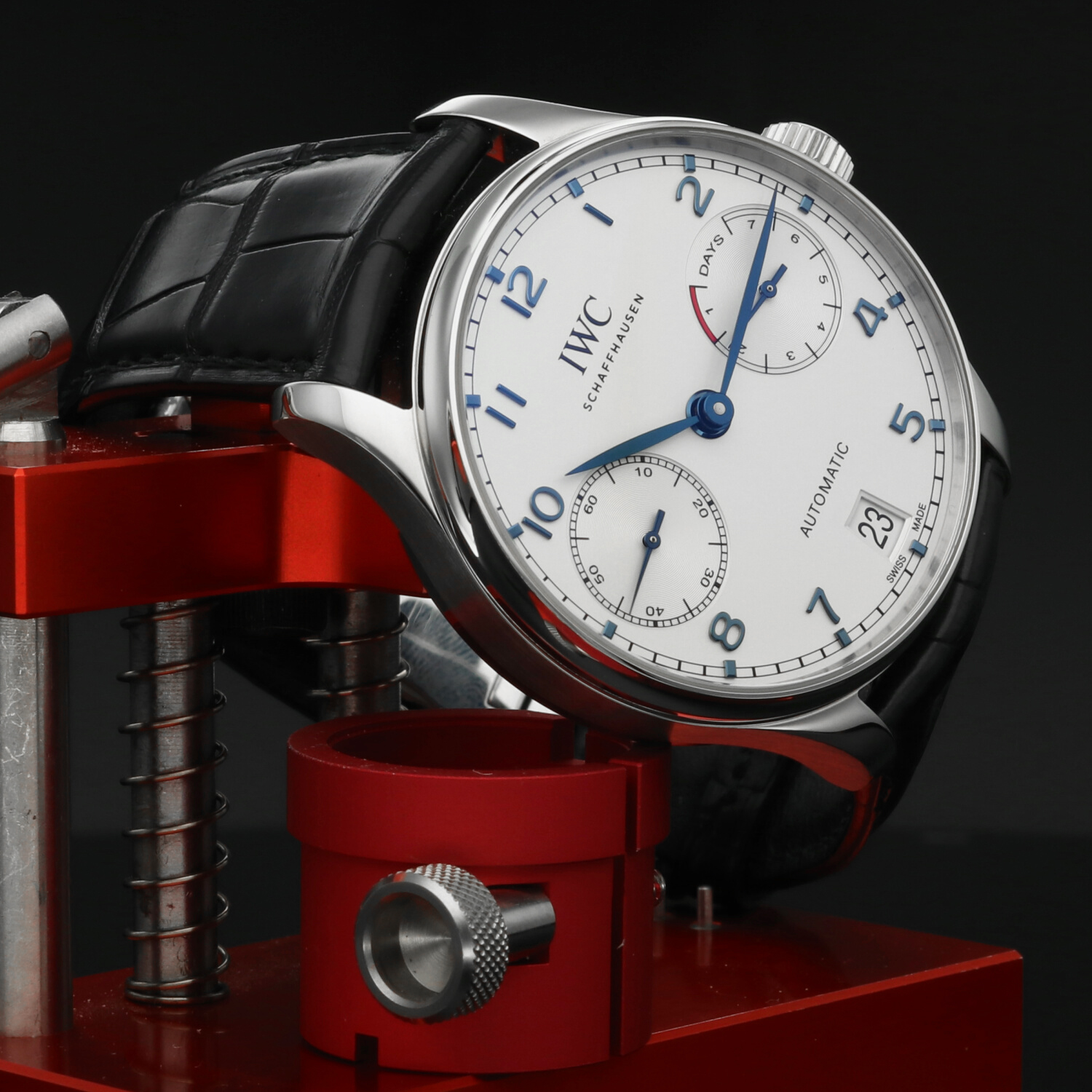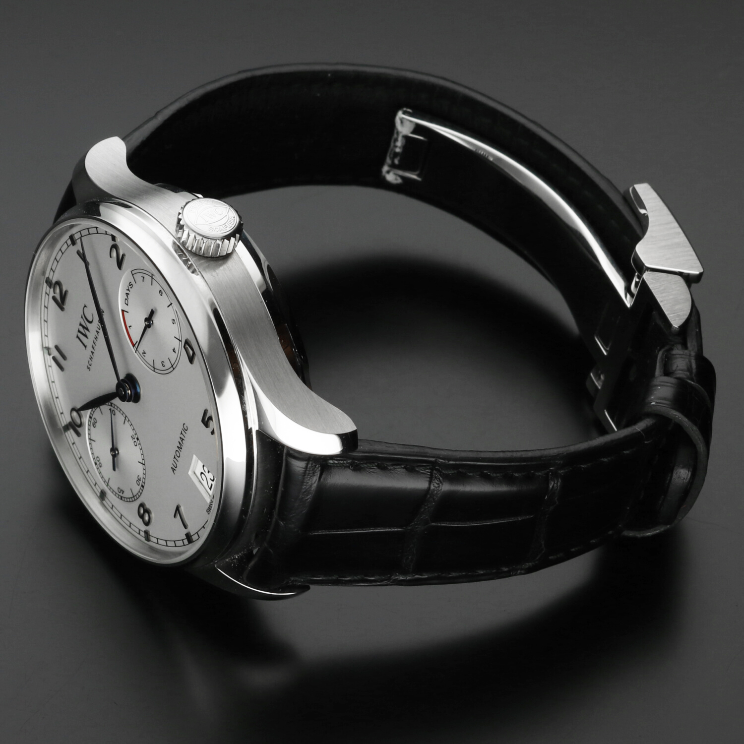 The stainless steel case of the IWC Portugieser Automatic 7 Days ref. IW500705 is in excellent condition, with little to no visible wear. The surfaces display only very light micro-lines, detectable exclusively under direct light and completely imperceptible on the wrist.