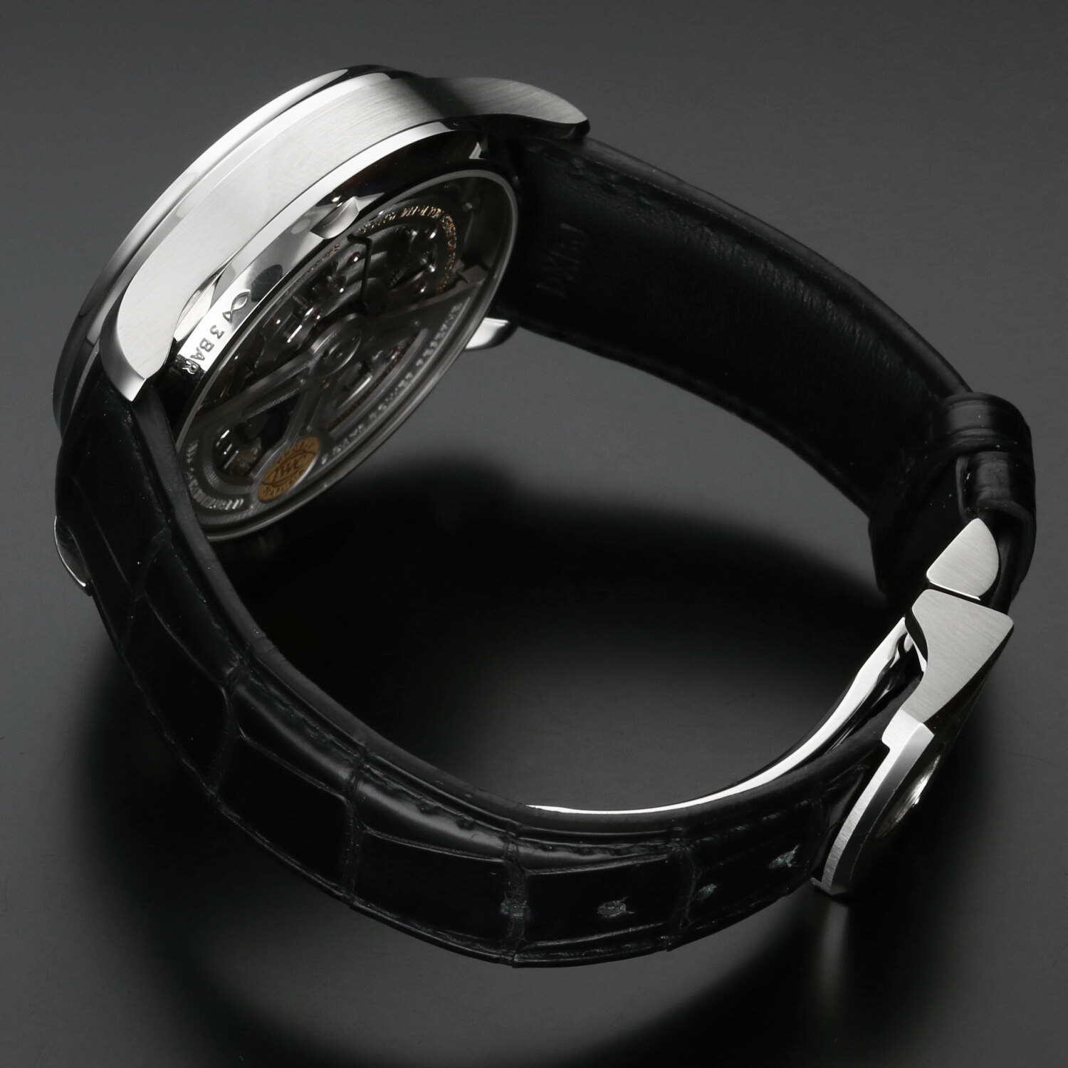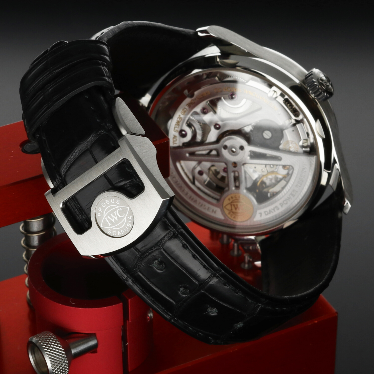 The silver opaline dial, adorned with applied Arabic numerals and refined feuille hands, embodies a pure and functional aesthetic, further enhanced by the harmonious layout featuring a power-reserve indicator at 3 o’clock and discreet date window at 6 o’clock. The 42.3 mm case is beautifully finished, offering both elegance and authority while remaining faithful to IWC’s understated identity.
