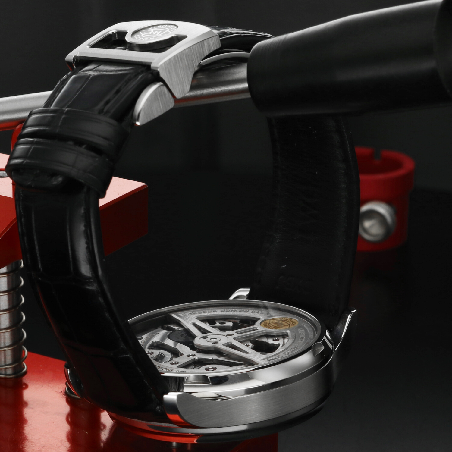 The black leather strap is also in excellent condition, virtually like new. The inner lining is free from any signs of wear or odour, confirming minimal or nearly absent use. The stainless steel folding clasp is equally well preserved, with little to no visible wear.