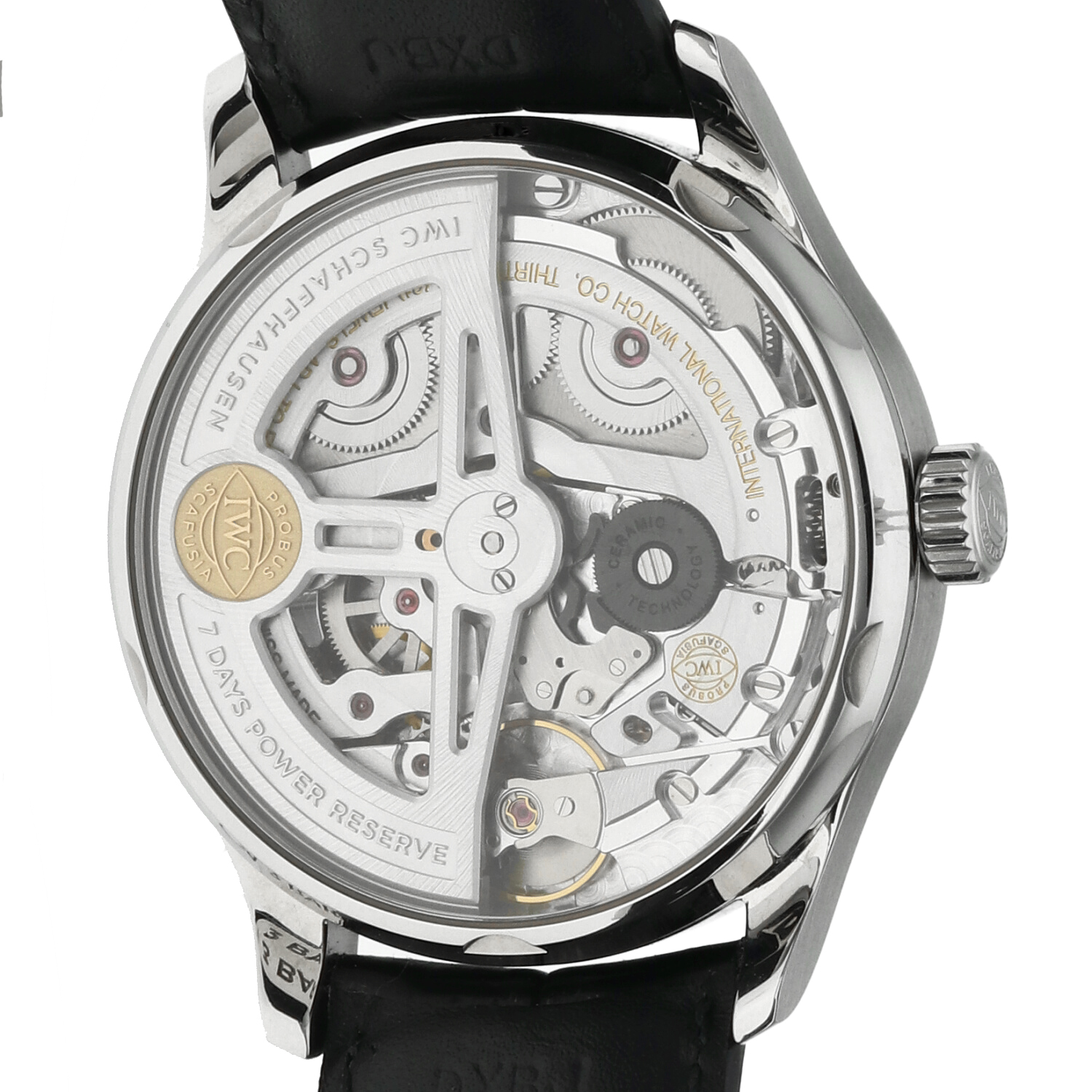 At its heart beats the in-house IWC Calibre 52010, an automatic movement equipped with the Pellaton winding system featuring ceramic components and delivering an impressive 7-day power reserve, a true signature of the Portugieser line. The sapphire caseback reveals the full beauty of the mechanism, from the decorated bridges to the intricately designed oscillating mass.