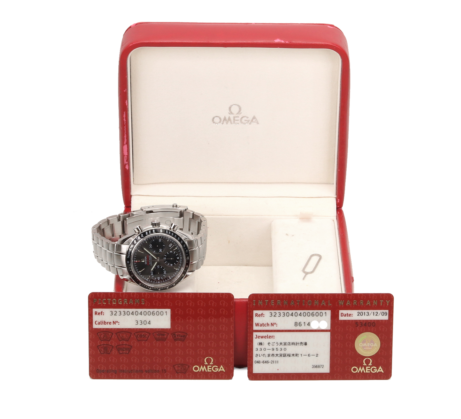 Originally sold by an official Omega retailer on December 9, 2013, the watch comes with its original inner Omega box (showing normal signs of age and missing the watch cushion), original international warranty card, pictograms card, and quick-date adjustment tool.