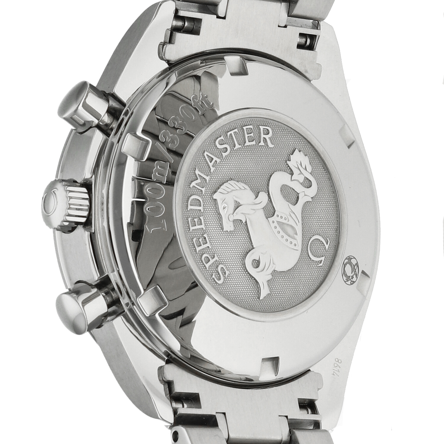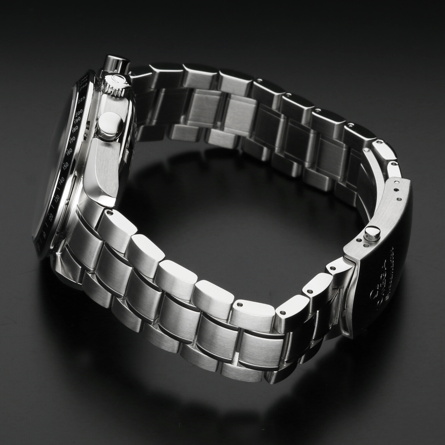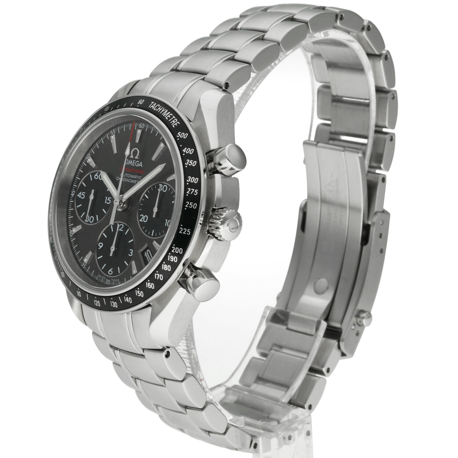 The stainless steel case of the Omega Speedmaster Automatic ref. 323.30.40.40.06.001 is in excellent condition, featuring a uniform satin finish that enhances the distinctive lines of the Speedmaster collection. The polished surfaces are also perfectly preserved, with no visible signs of wear, confirming the careful handling of the watch.