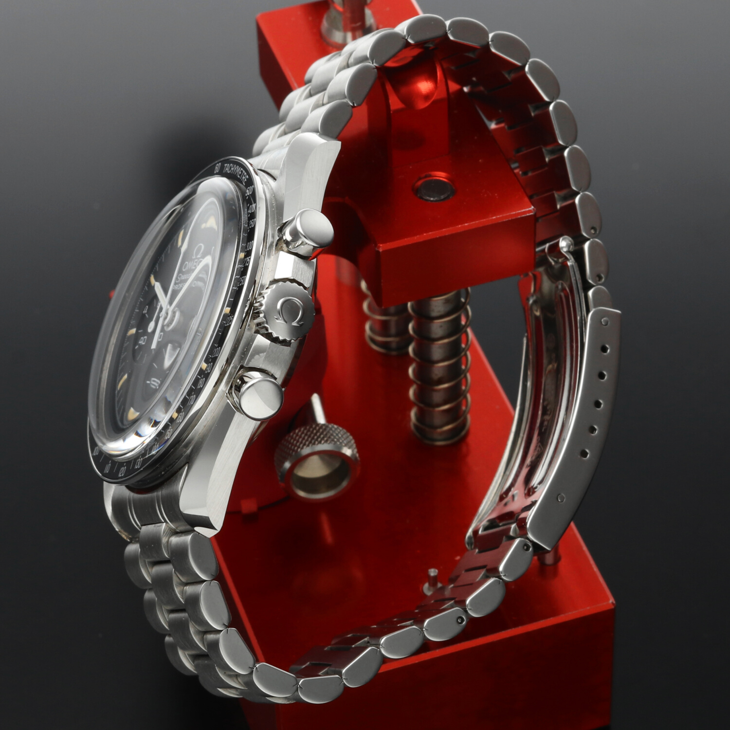 The hesalite crystal is clear and free from significant scratches, allowing the dial to be admired in full brilliance while offering the warm, soft reflections typical of pre-Luminova (tritium) Speedmaster models.