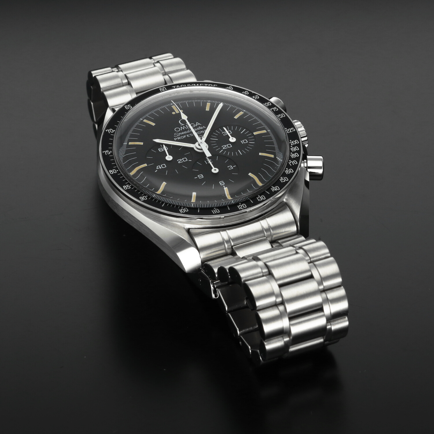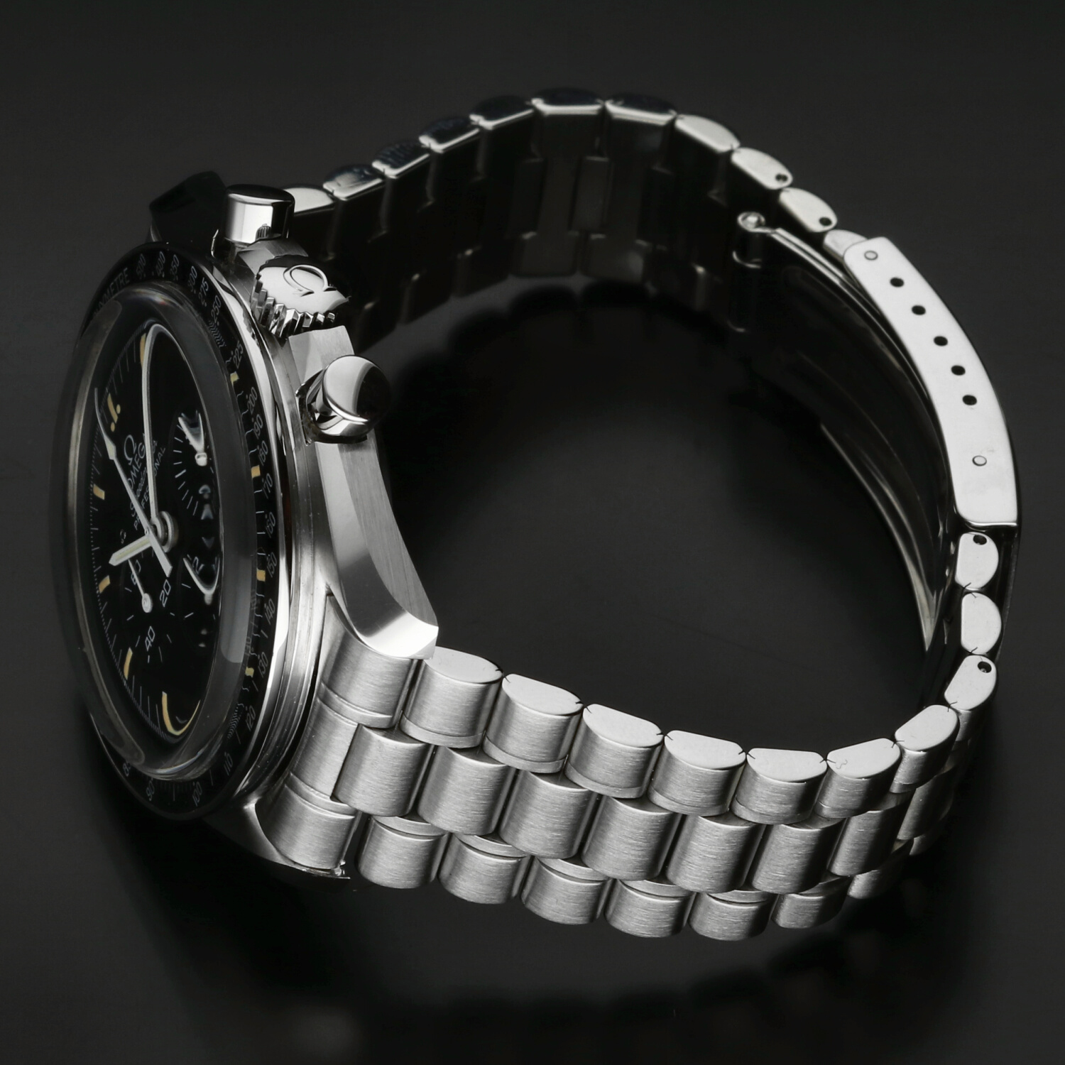 The matte black dial is perfectly preserved, featuring tritium hands and hour markers that have developed a warm sandy-golden patina consistent with the age of the watch. The white print remains sharp, the logo and minute track perfectly crisp, highlighting the graphic purity that makes the Speedmaster an enduring icon.