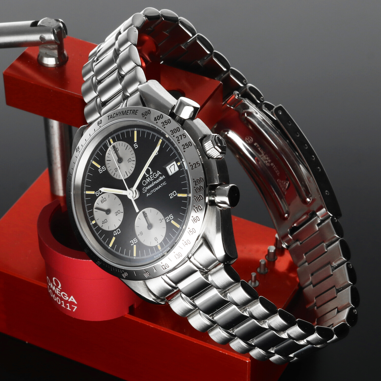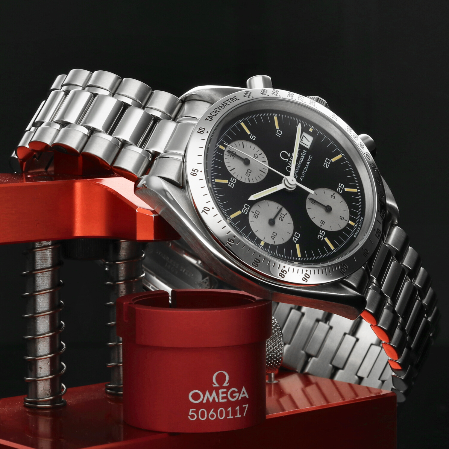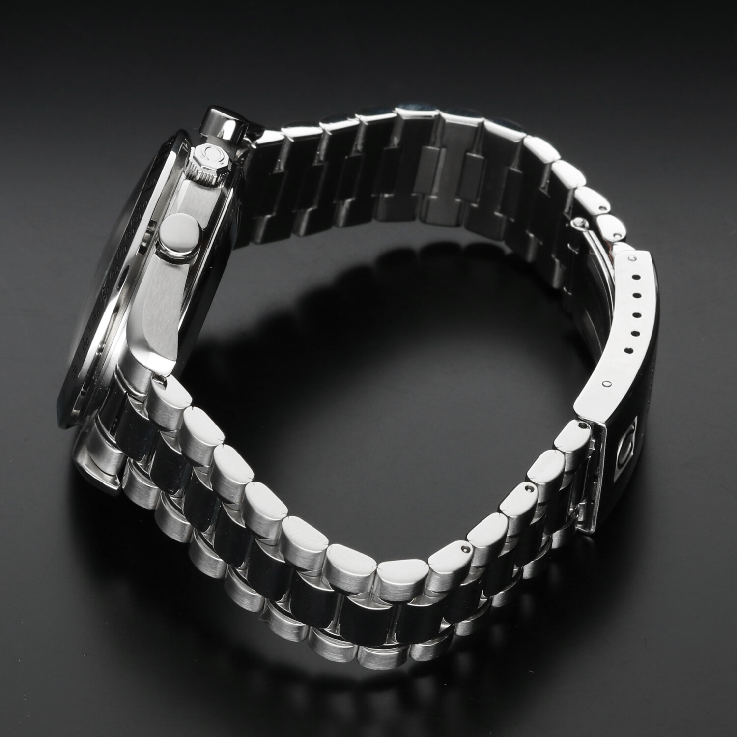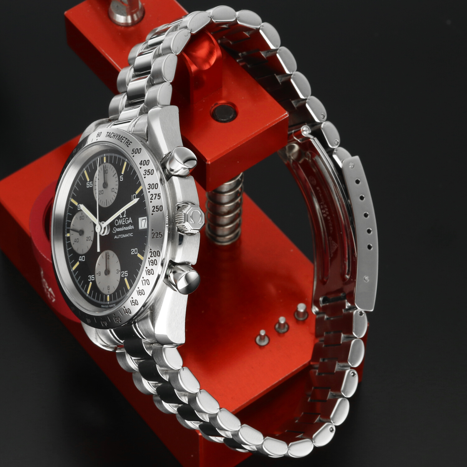 The case of the Omega Speedmaster Reduced Date ref. 3511.50.00 is in excellent condition, showing only light signs of wear. A professional polishing has brought the watch back to its original shine, enhancing the classic lines of this model. Minor traces of handling remain, barely noticeable and invisible when the watch is worn. The stainless steel tachymeter bezel also retains its refined appearance, with only minimal wear that does not detract from the overall brilliance and coherence of the case.