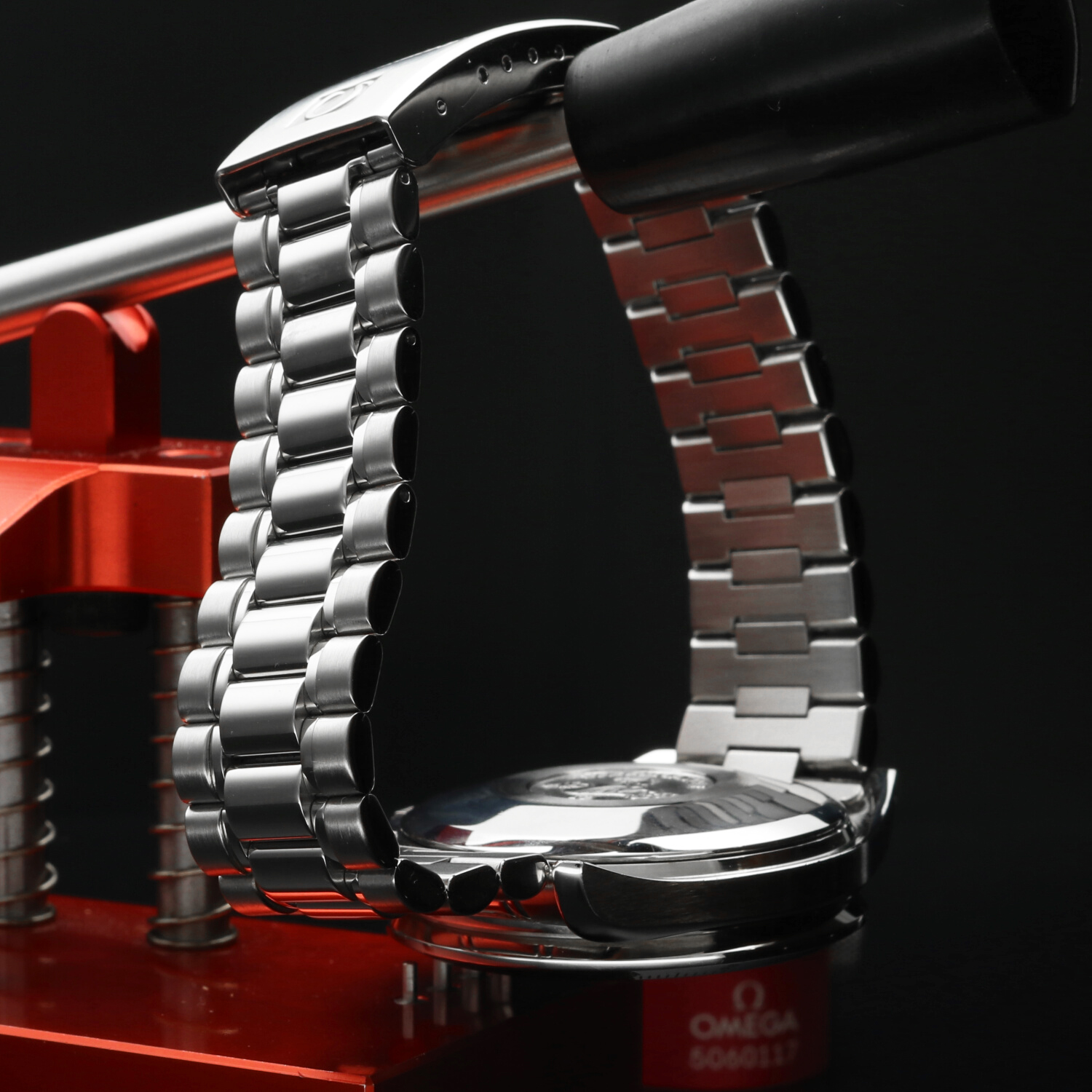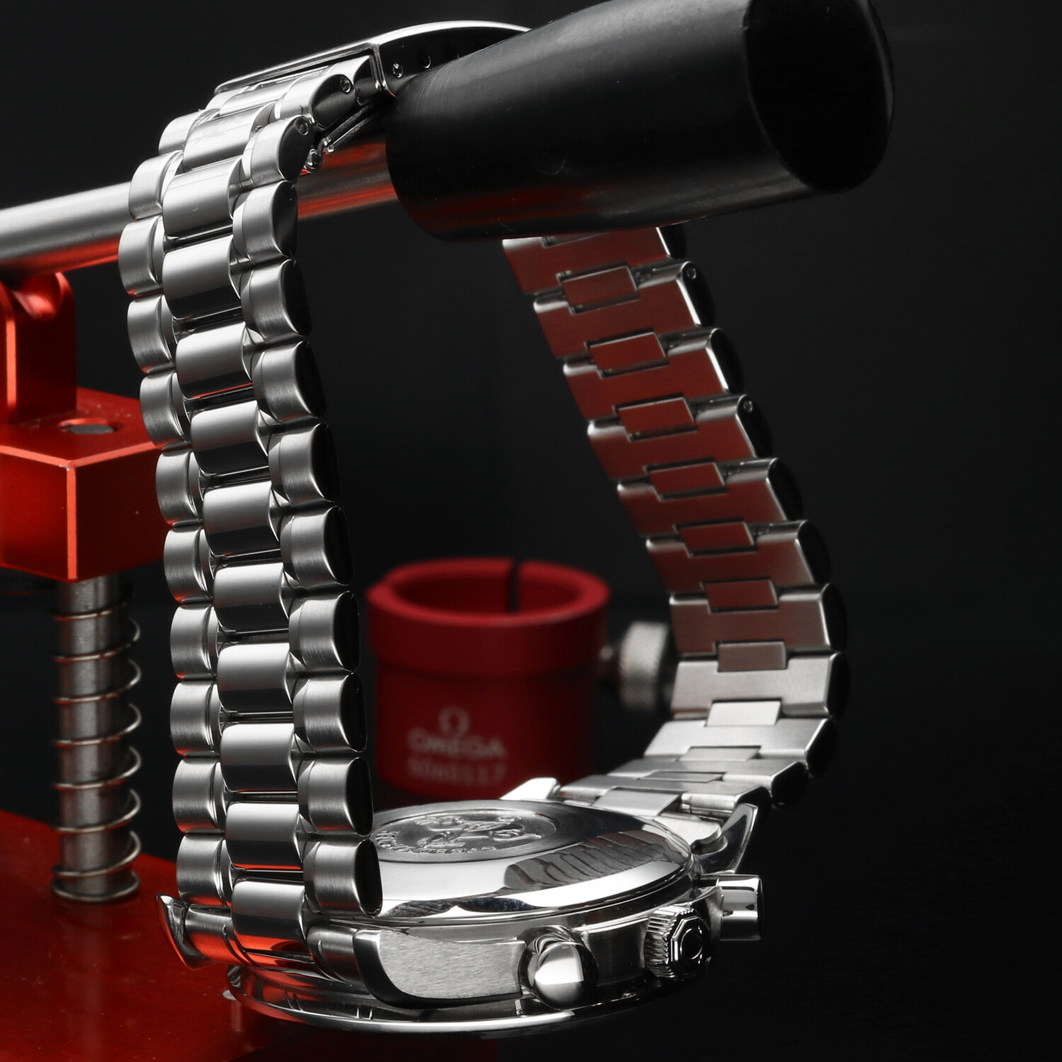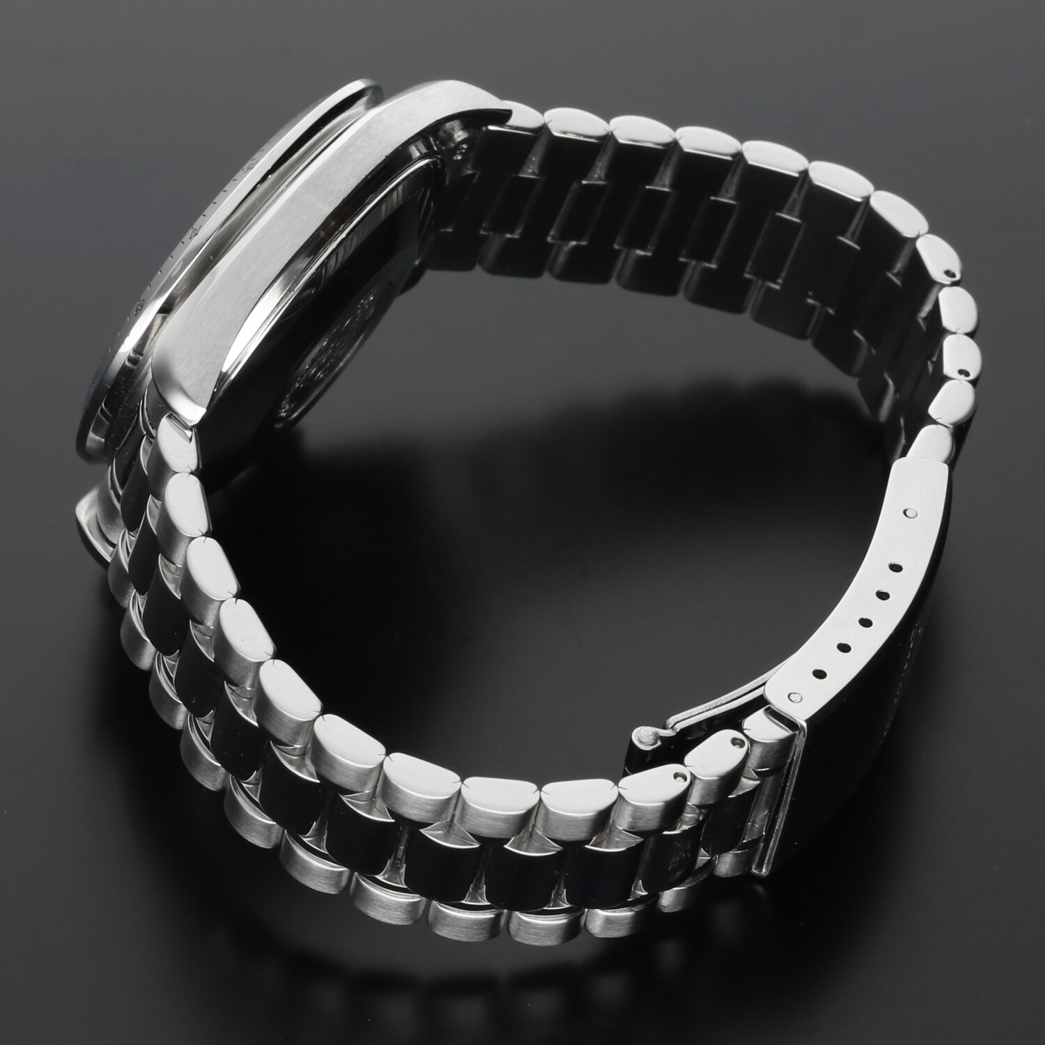 The Omega bracelet ref. 1469 with 813 end links, composed of 24 original links, is complete and fits wrists up to approximately 21.5 cm in circumference. It remains in excellent condition, with its alternating polished and satin surfaces carefully restored to their original luster.