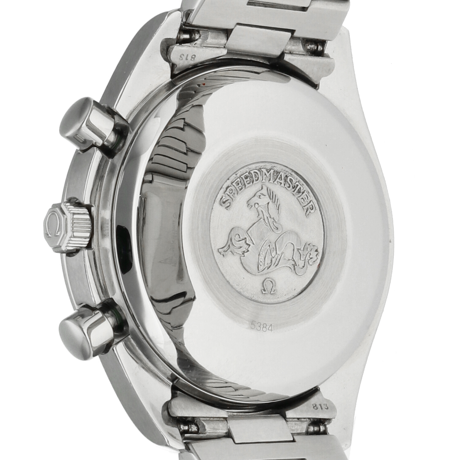A particularly distinctive element of this model is the hexagonal crown, an unusual detail that adds originality and a unique character instantly recognizable to Speedmaster enthusiasts. The stainless-steel bracelet, featuring polished center links, recalls the sporty refinement of 1980s Moonwatches and adds a touch of understated elegance.