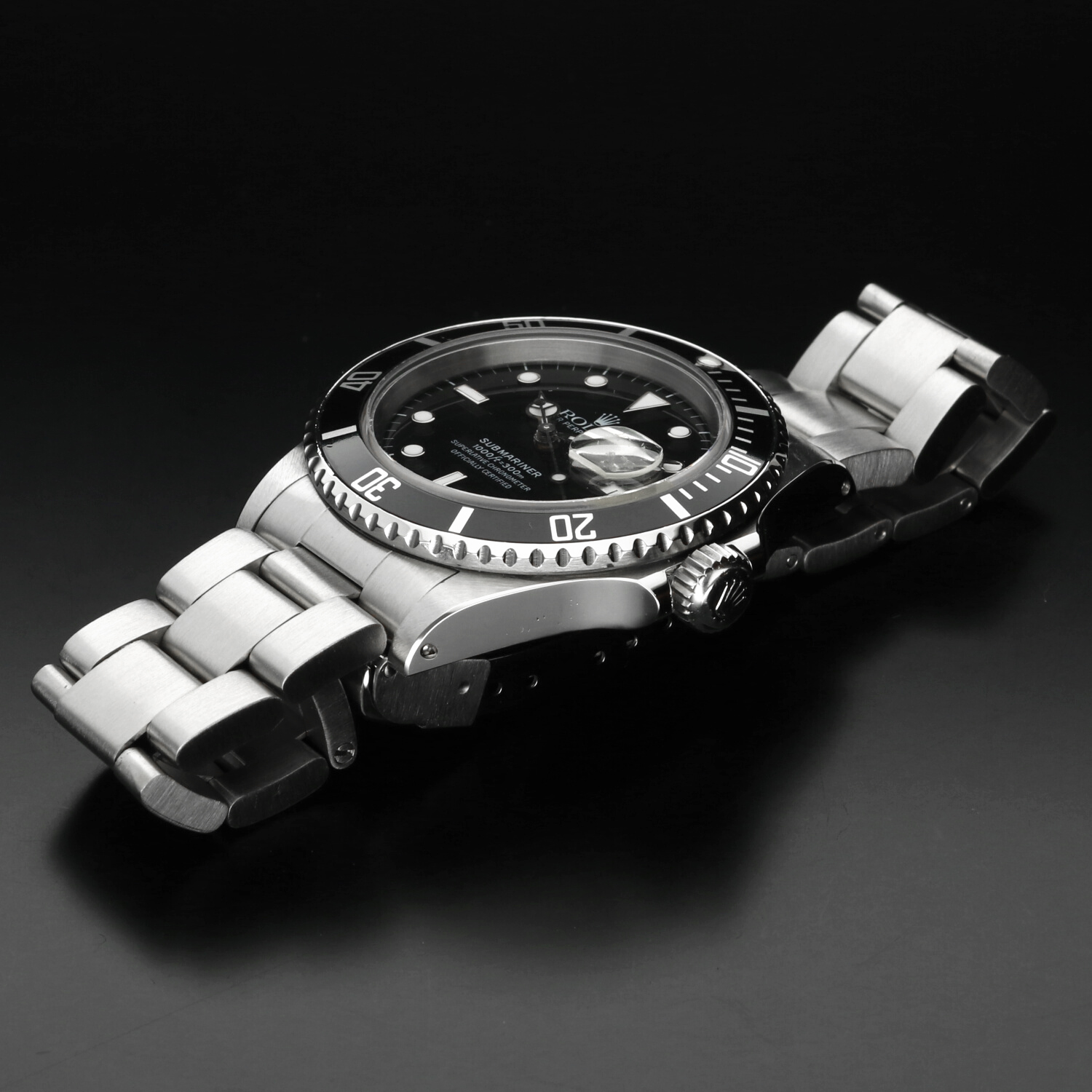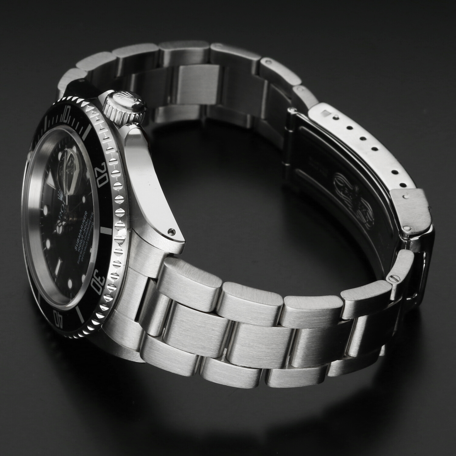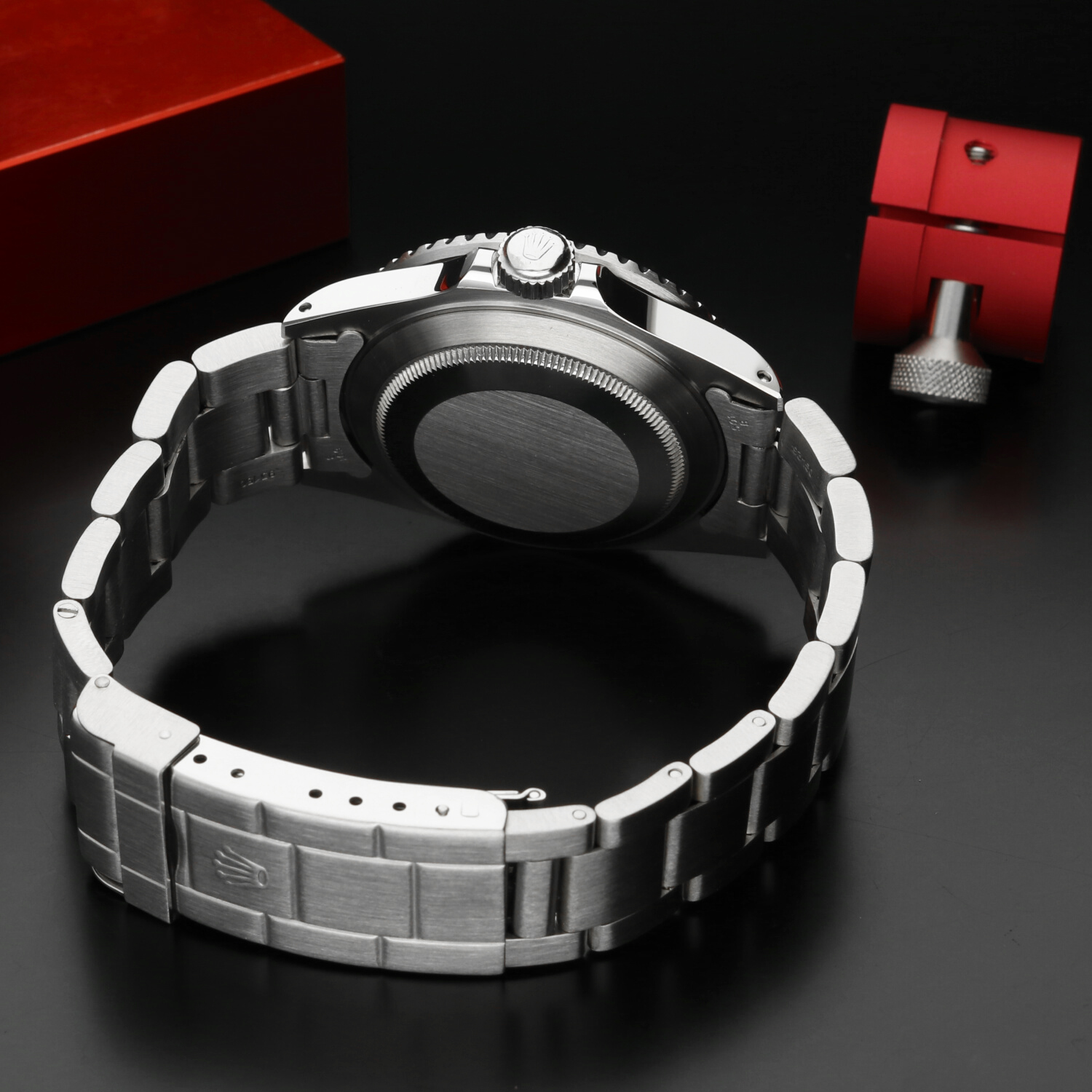 The 40 mm stainless steel Oyster case is in excellent condition, with light signs of wear limited primarily to the polished surfaces. The black aluminium bezel insert, a signature element of the pre-ceramic series, is also in excellent condition, showing normal wear consistent with age and careful use.
