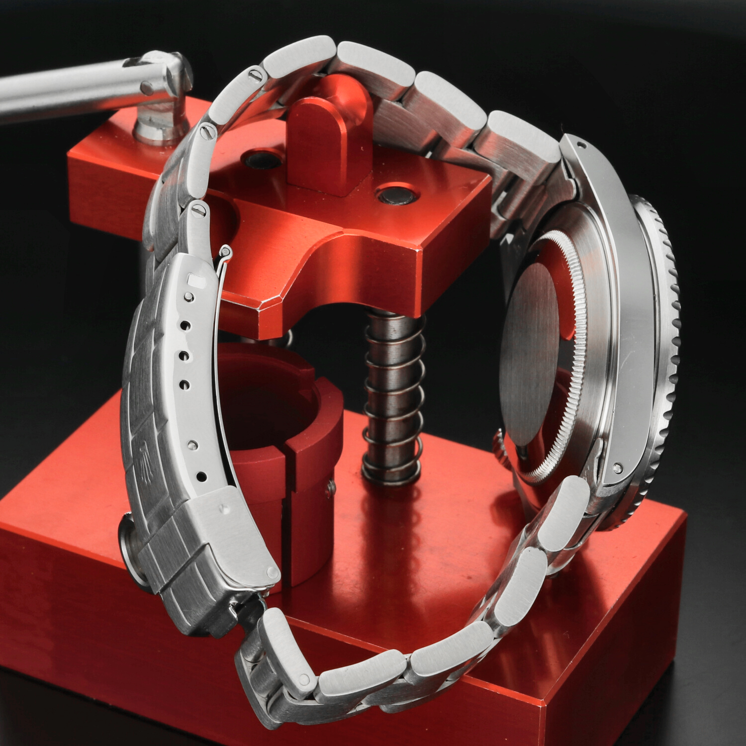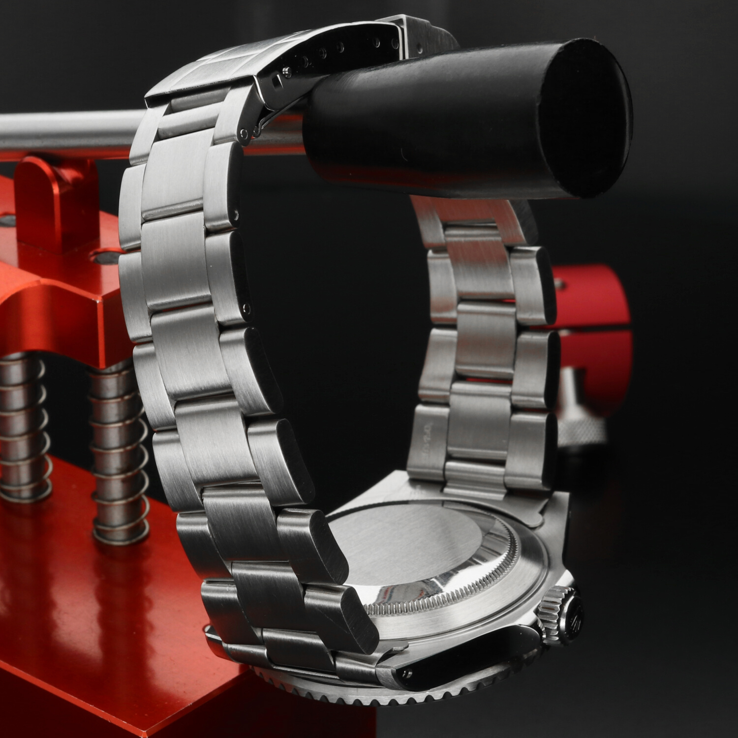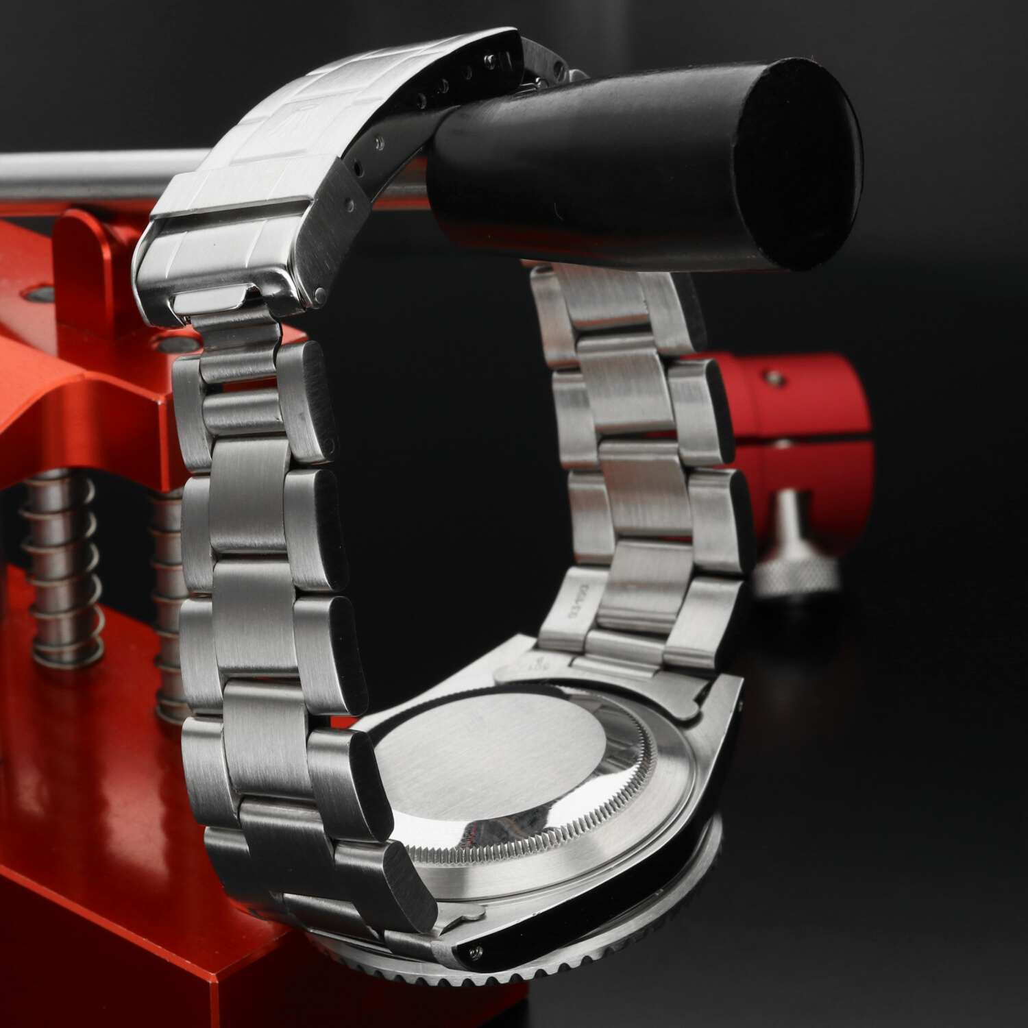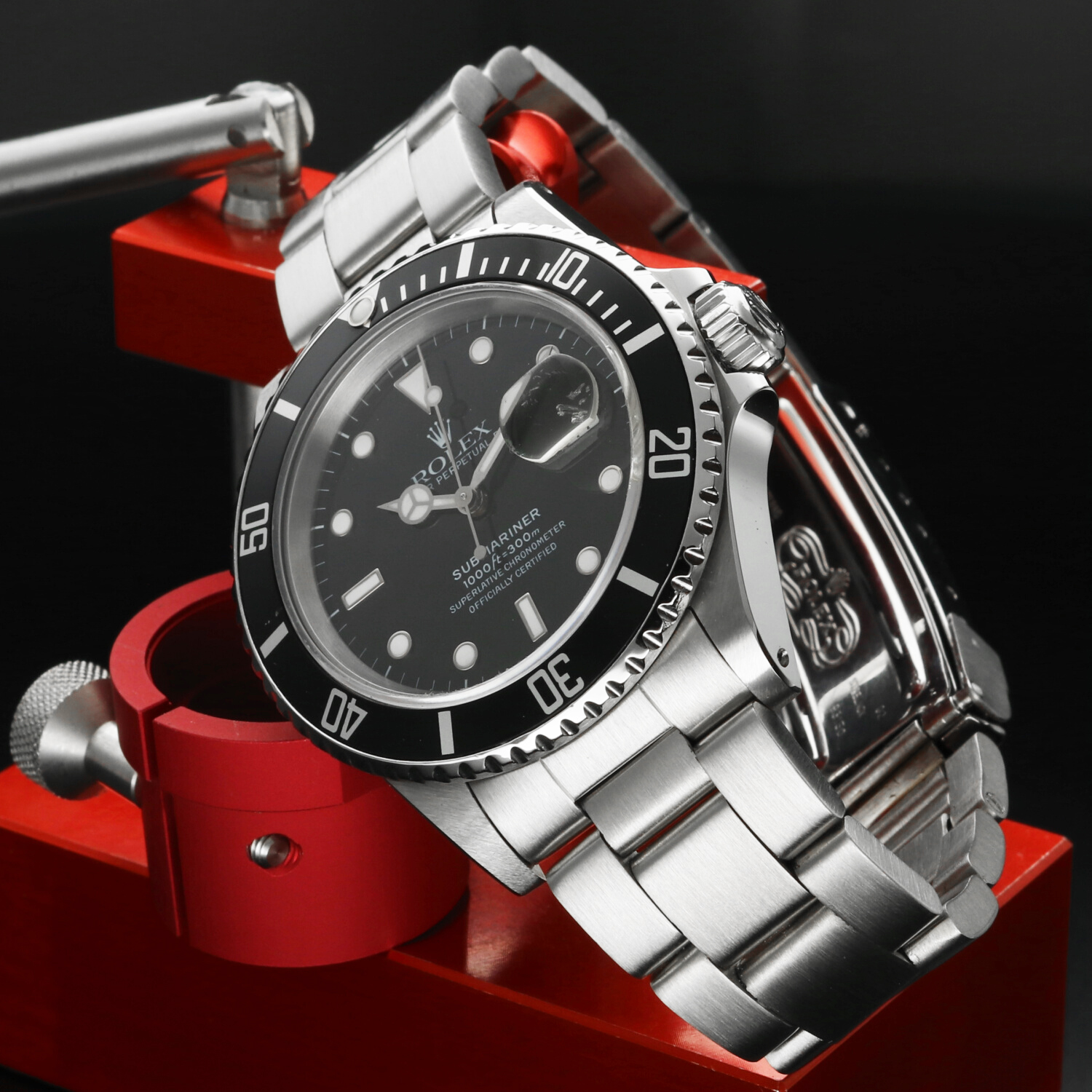 The 40 mm stainless steel Oyster case is in excellent condition, with light signs of wear limited primarily to the polished surfaces. The black aluminium bezel insert, a signature element of the pre-ceramic series, is also in excellent condition, showing normal wear consistent with age and careful use.