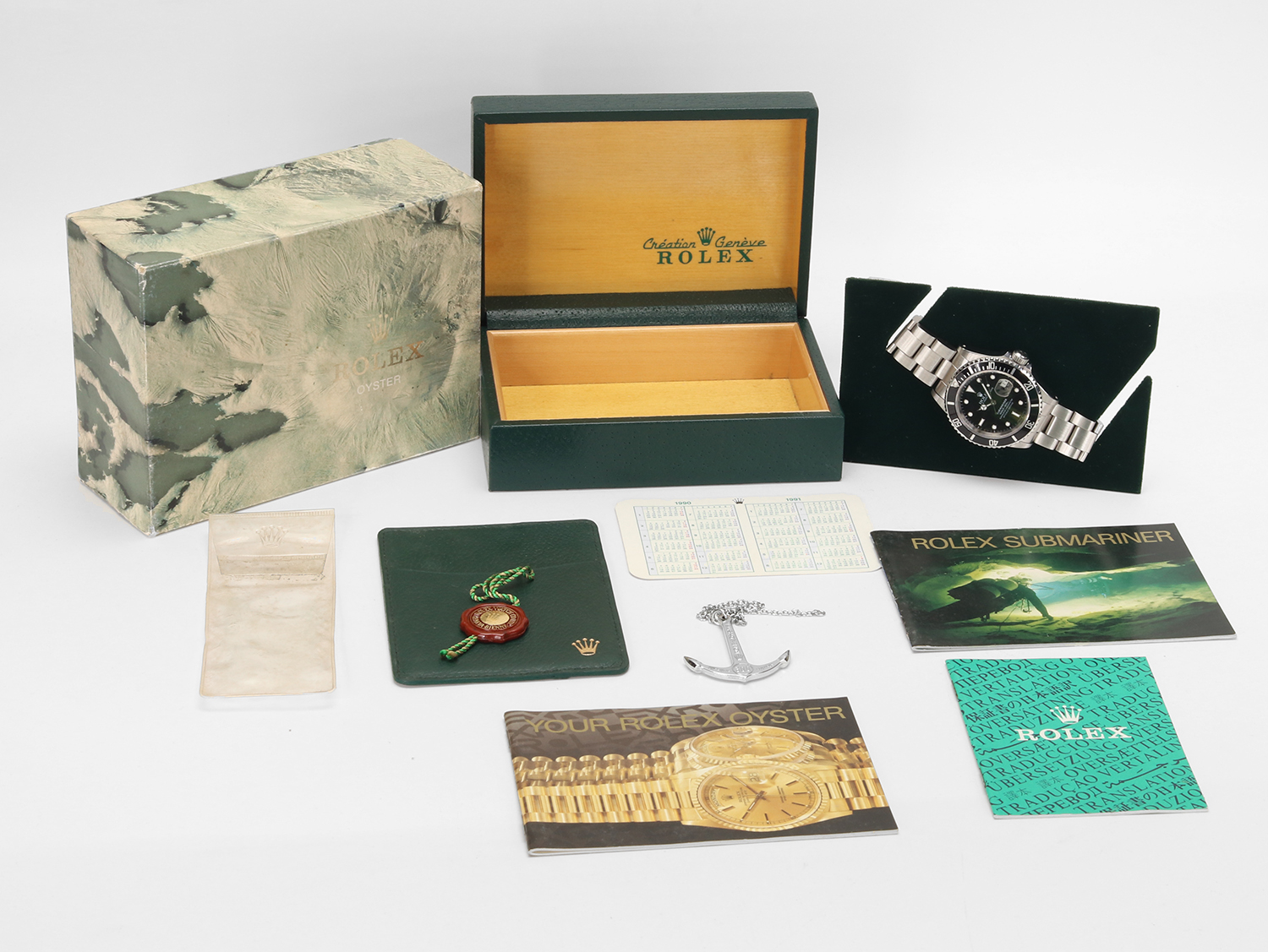 The watch is accompanied by a complete set of accessories, with the exception of the original warranty card. Included are the Rolex inner box with its outer cardboard box, the Submariner booklet, additional Rolex literature, the leather warranty holder, the calendar, the metal Rolex anchor, and the bordeaux seal.