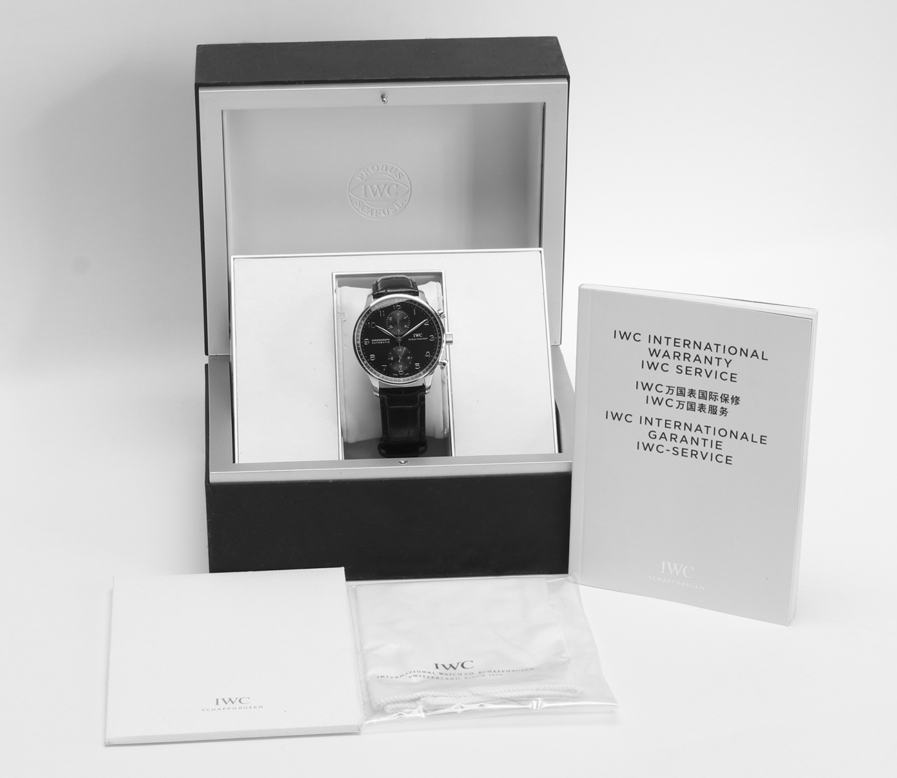 L’orologio è corredato da scatola originale IWC interna (restaurata ma con normali segni del tempo), libretto e panno.