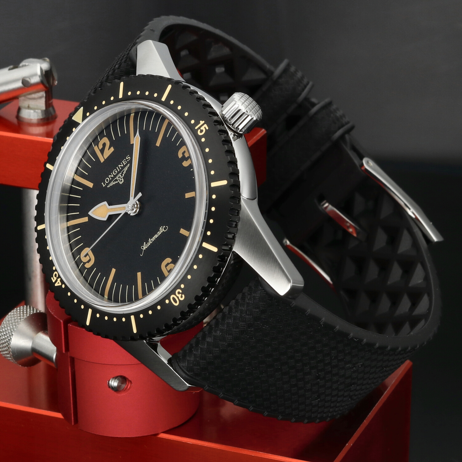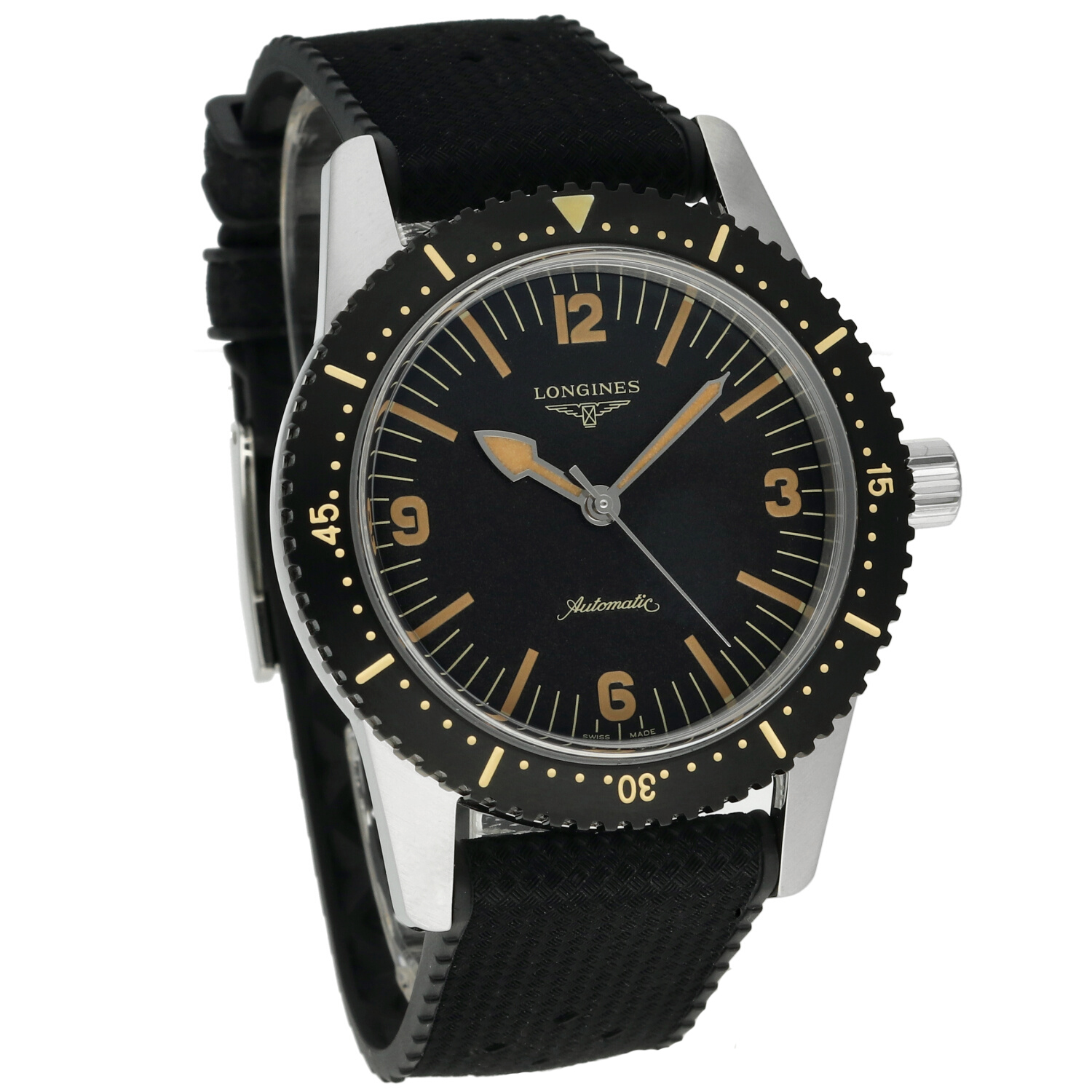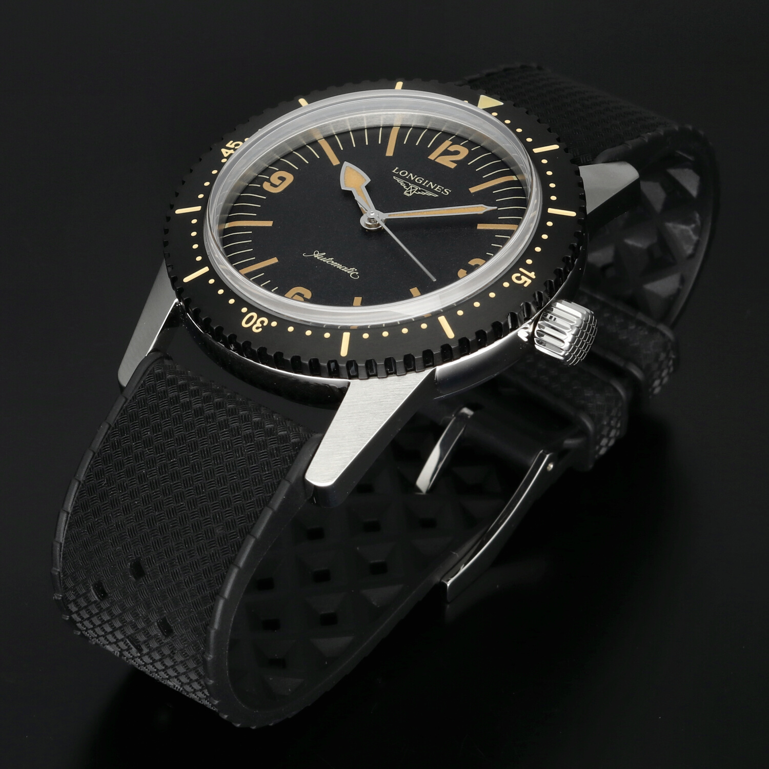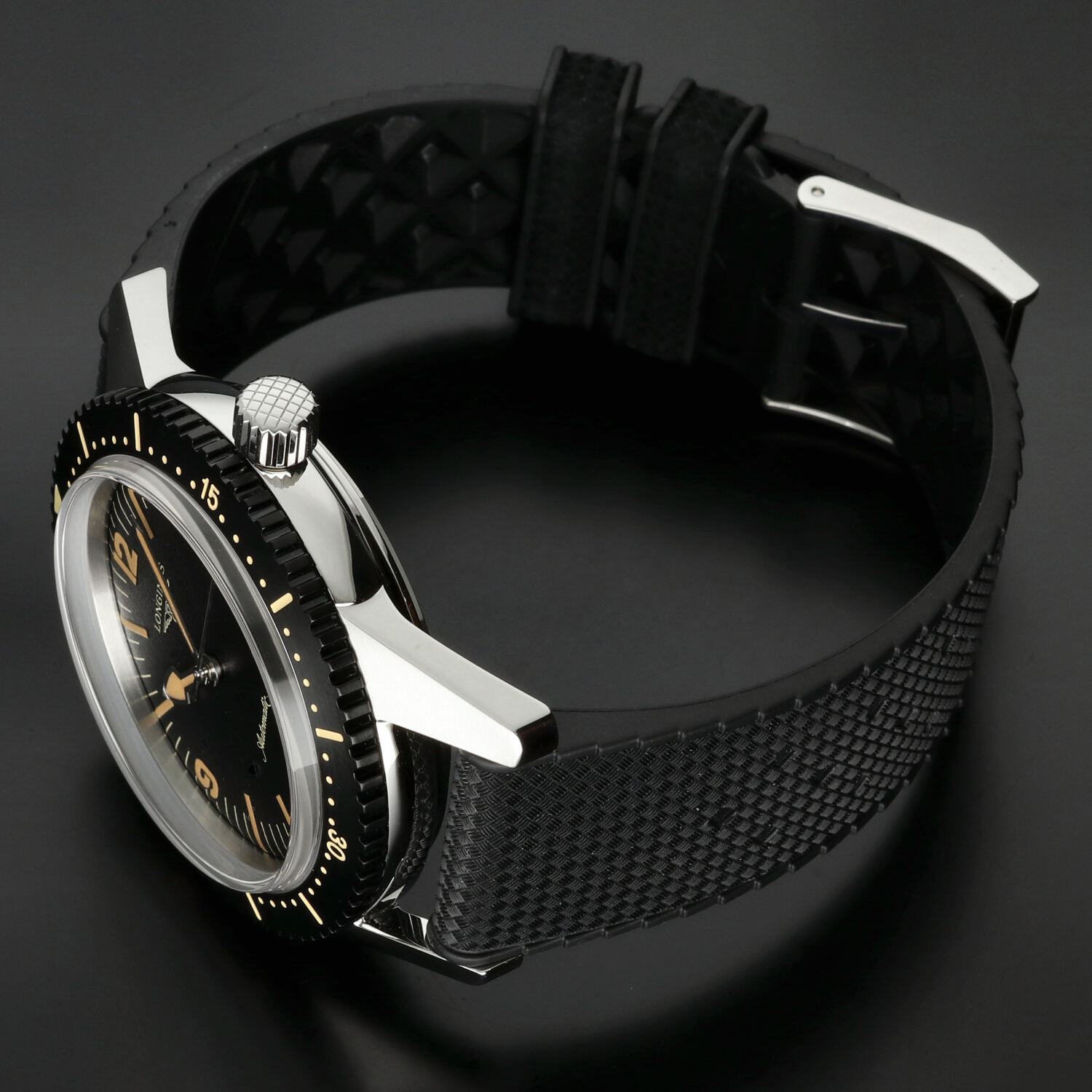 Cinturino: Il cinturino originale Longines in gomma nera è in condizioni pari al nuovo. Morbido, elastico e confortevole al polso, valorizza l’anima sportiva del modello. La fibbia ad ardiglione in acciaio si presenta nelle medesime condizioni, priva di segni evidenti di utilizzo.