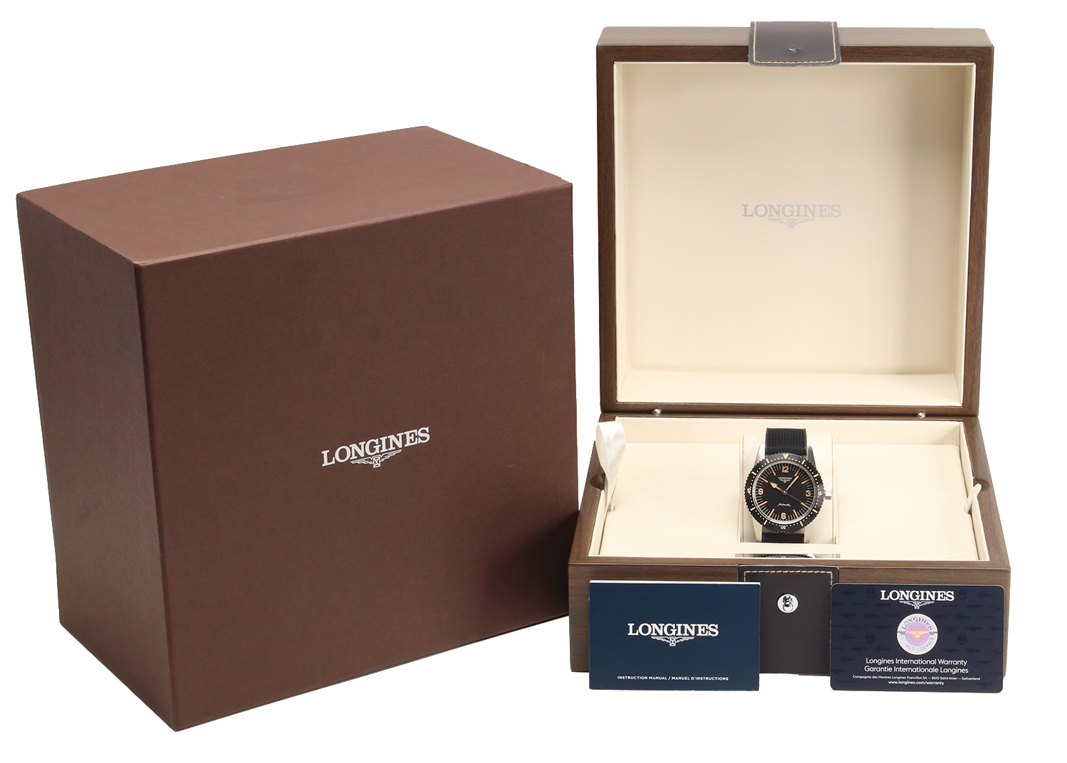 L’orologio è accompagnato dalla sua scatola originale Longines Skin Diver interna, dalla contro-scatola in cartone, dalla garanzia originale non compilata (priva di data e timbro) e dalla quick start guide. Completa la dotazione la nostra card di garanzia personalizzata O&D Vintage insieme al certificato di autenticità e lecita provenienza.