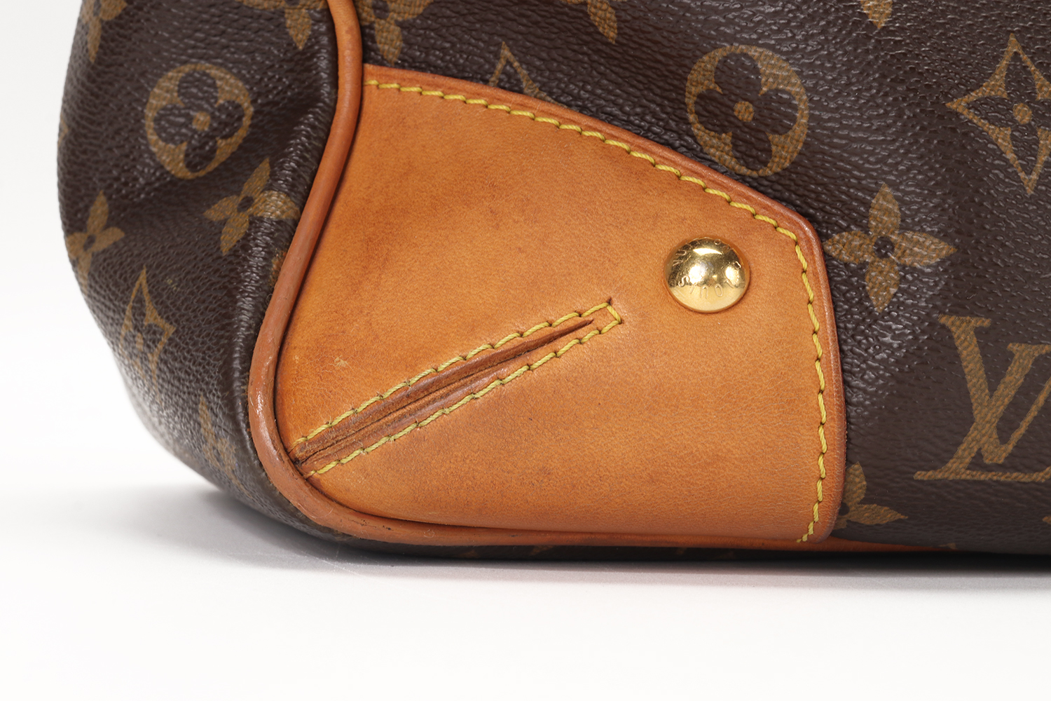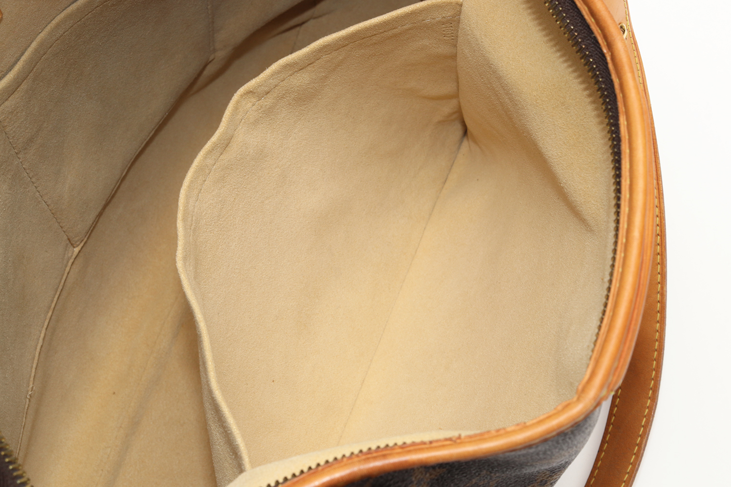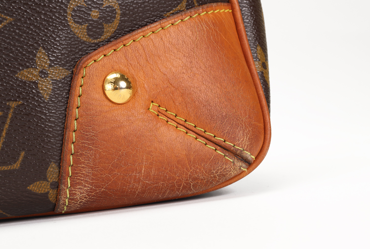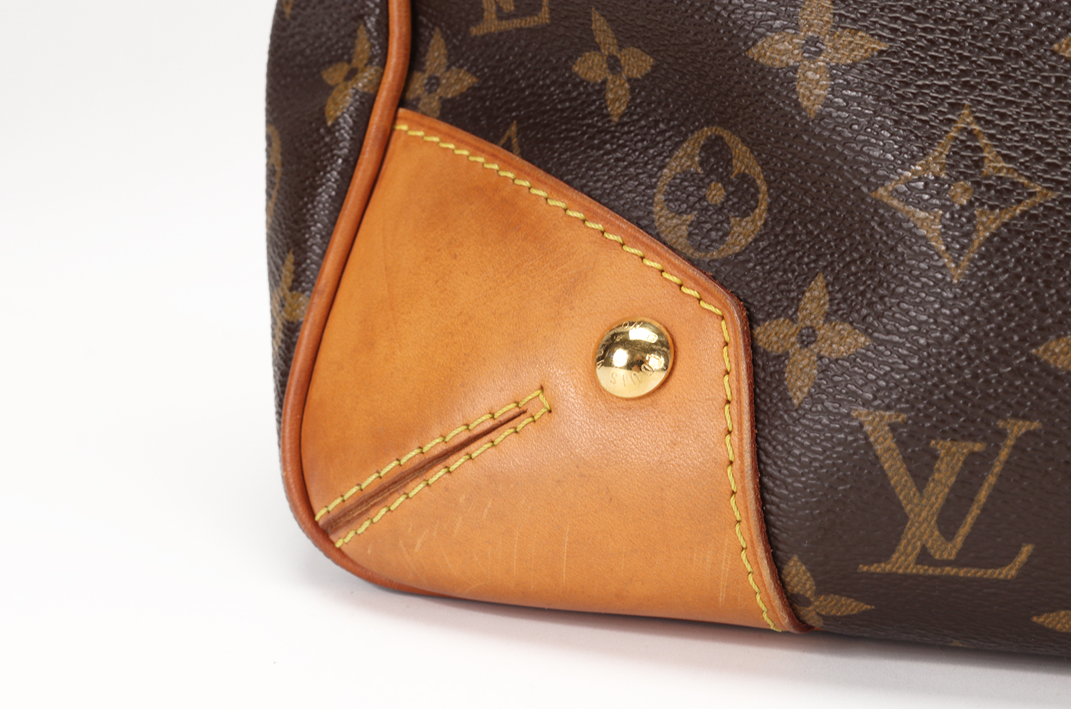 La vacchetta naturale rivela una patina ambrata armoniosa, quell’evoluzione calda e morbida del colore che rende uniche le borse Louis Vuitton man mano che accompagnano la vita di chi le indossa. Un angolo presenta una tonalità leggermente più scura con piccole crepe superficiali, mentre in un altro angolo il profilo in pelle è stato restaurato in modo professionale: un intervento discreto, perfettamente integrato nel resto della borsa. Il risultato complessivo è di estrema cura estetica, con una pelle che mostra la sua storia senza perdere eleganza.