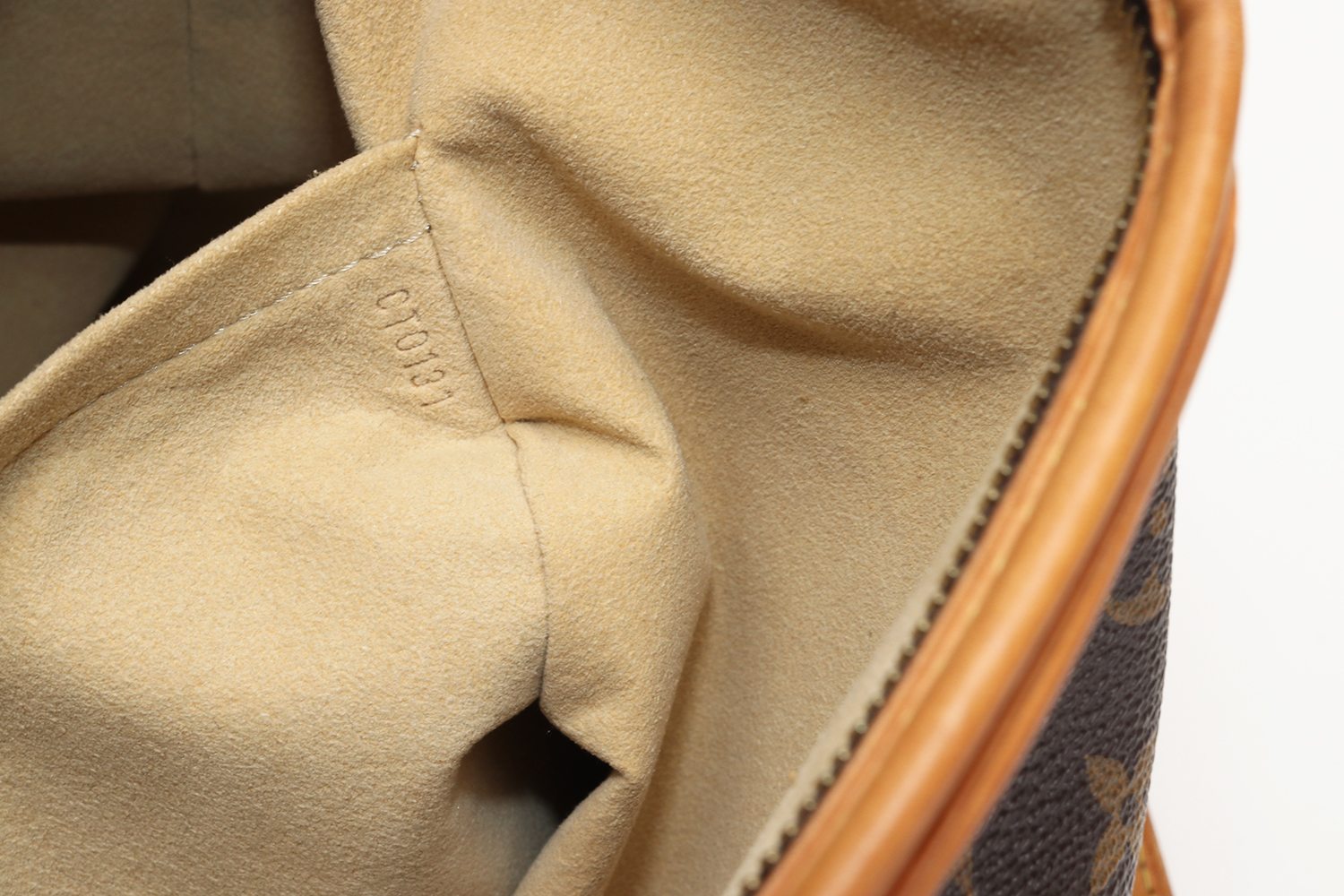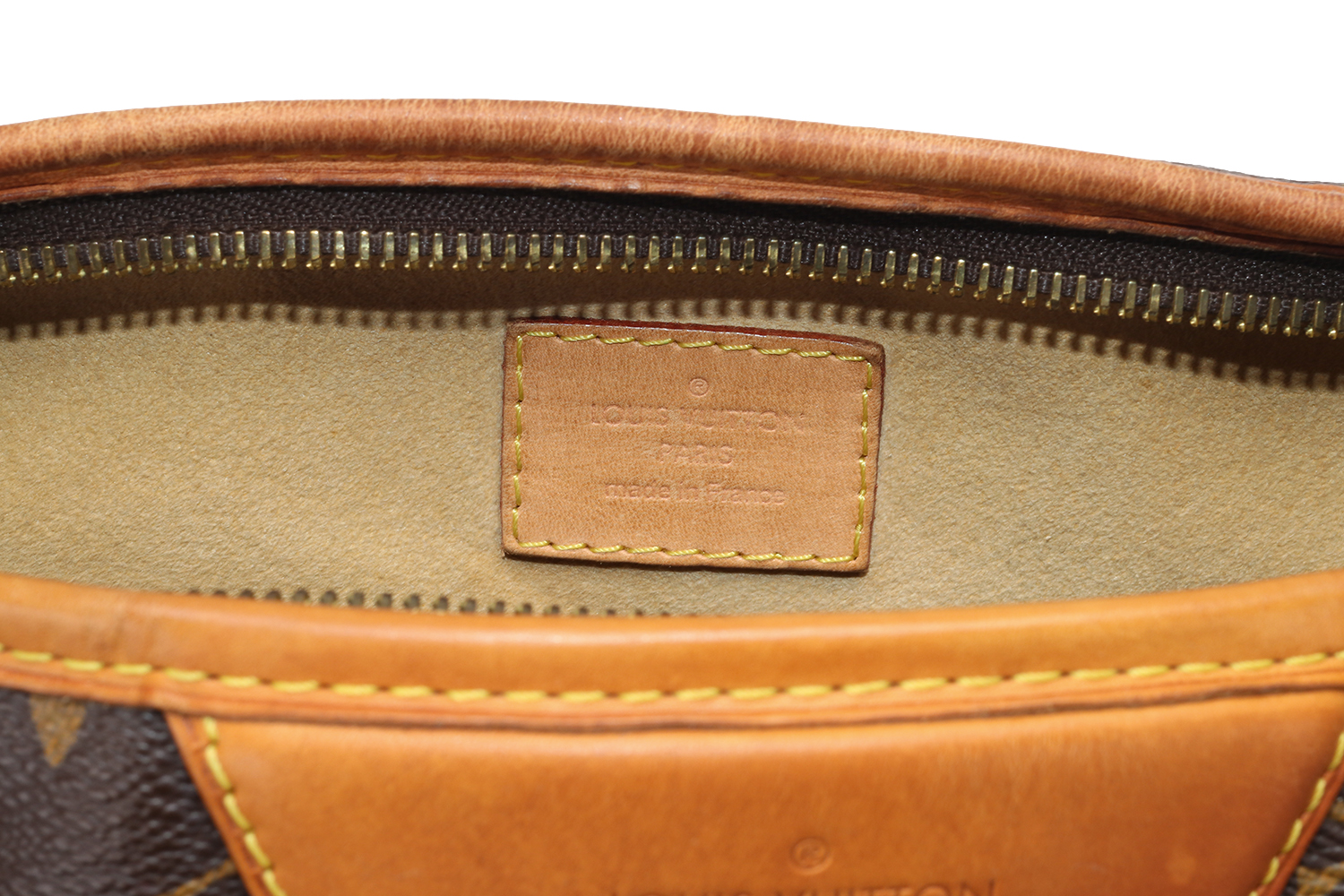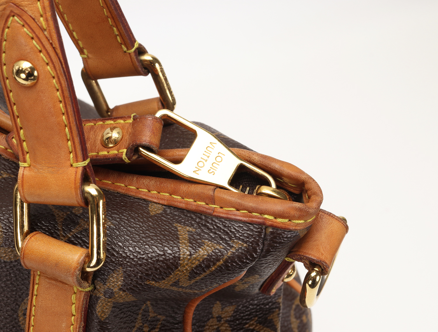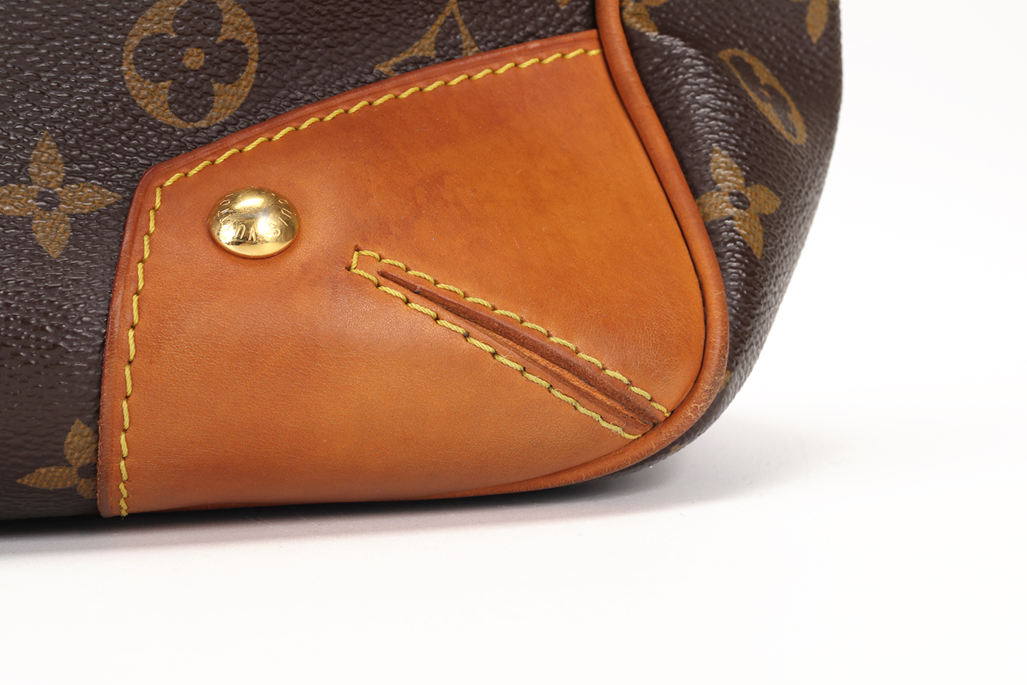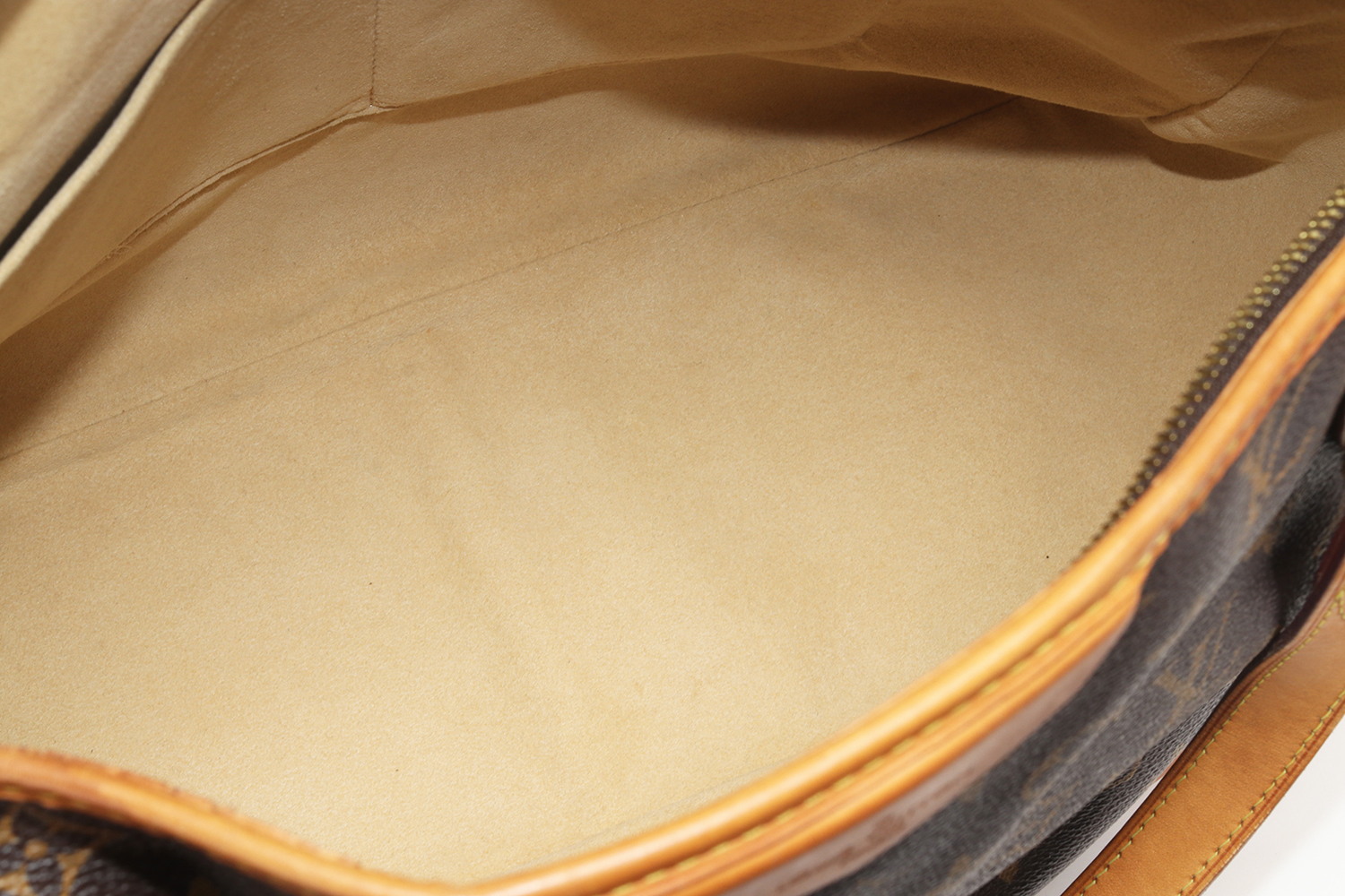 La vacchetta naturale rivela una patina ambrata armoniosa, quell’evoluzione calda e morbida del colore che rende uniche le borse Louis Vuitton man mano che accompagnano la vita di chi le indossa. Un angolo presenta una tonalità leggermente più scura con piccole crepe superficiali, mentre in un altro angolo il profilo in pelle è stato restaurato in modo professionale: un intervento discreto, perfettamente integrato nel resto della borsa. Il risultato complessivo è di estrema cura estetica, con una pelle che mostra la sua storia senza perdere eleganza.