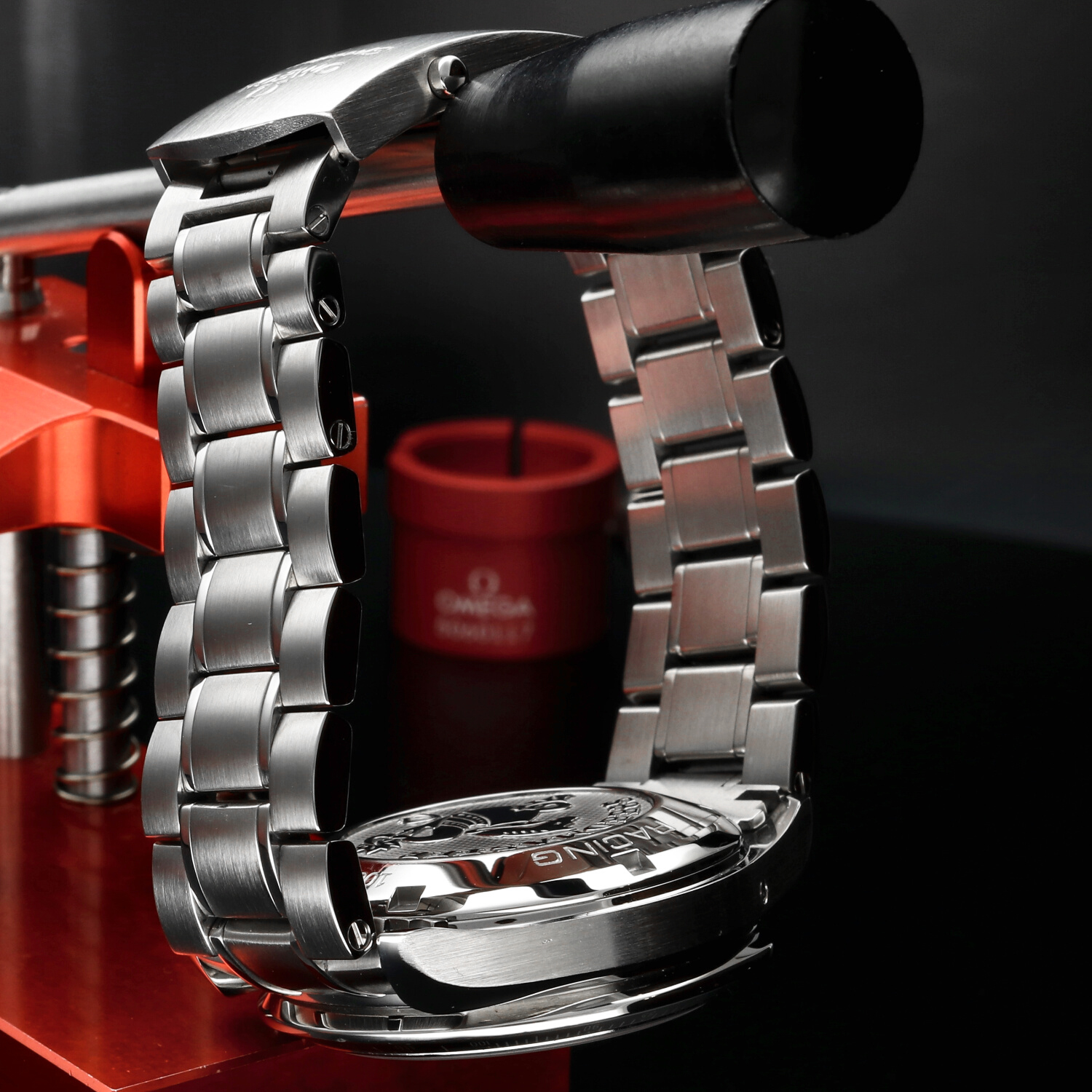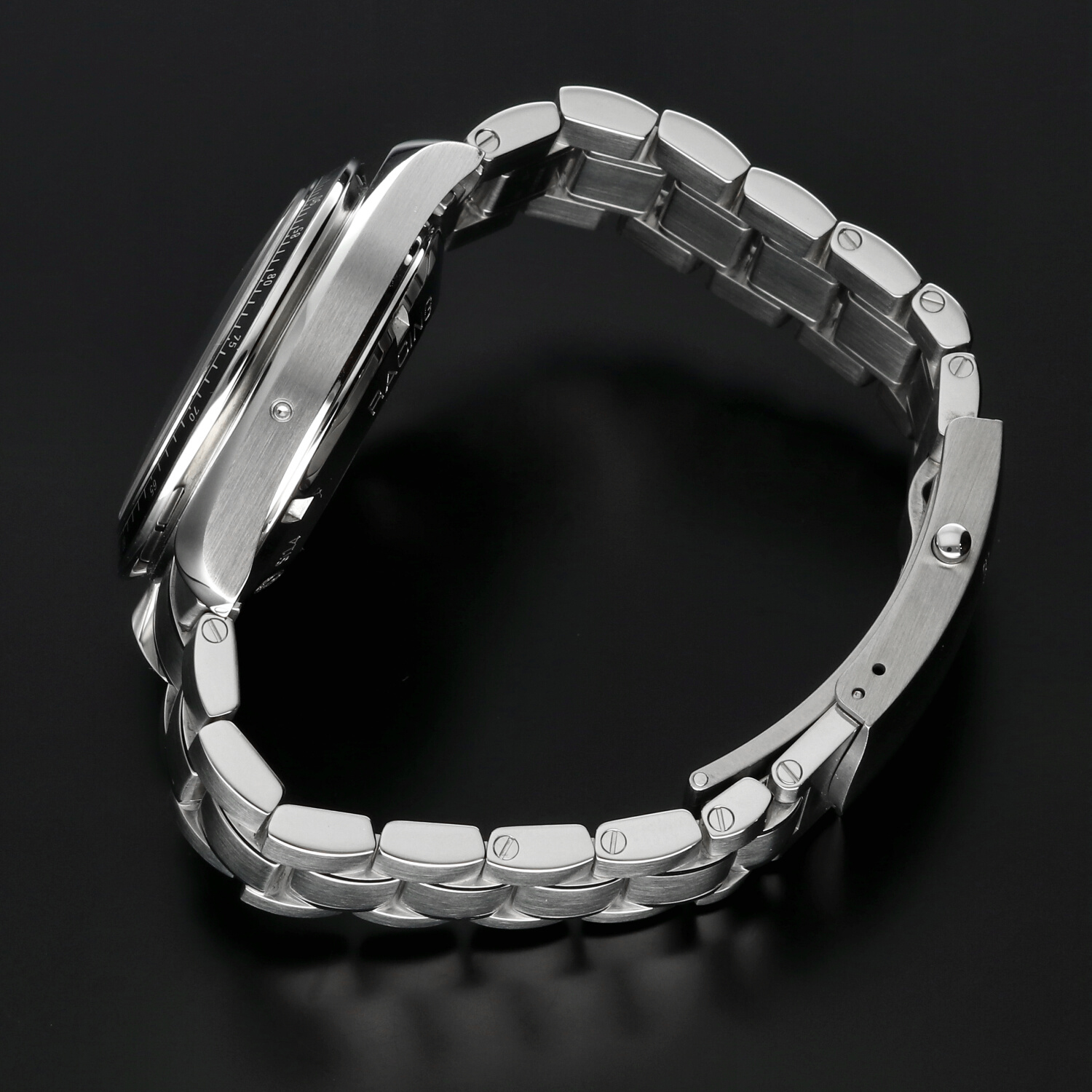 Bracciale: Il bracciale in acciaio è in condizioni eccellenti, con poca o nessuna usura. Presenta un allungamento quasi nullo; mancano 2 maglie e, per questa ragione, veste polsi fino a un massimo di circa 19 cm di circonferenza.
