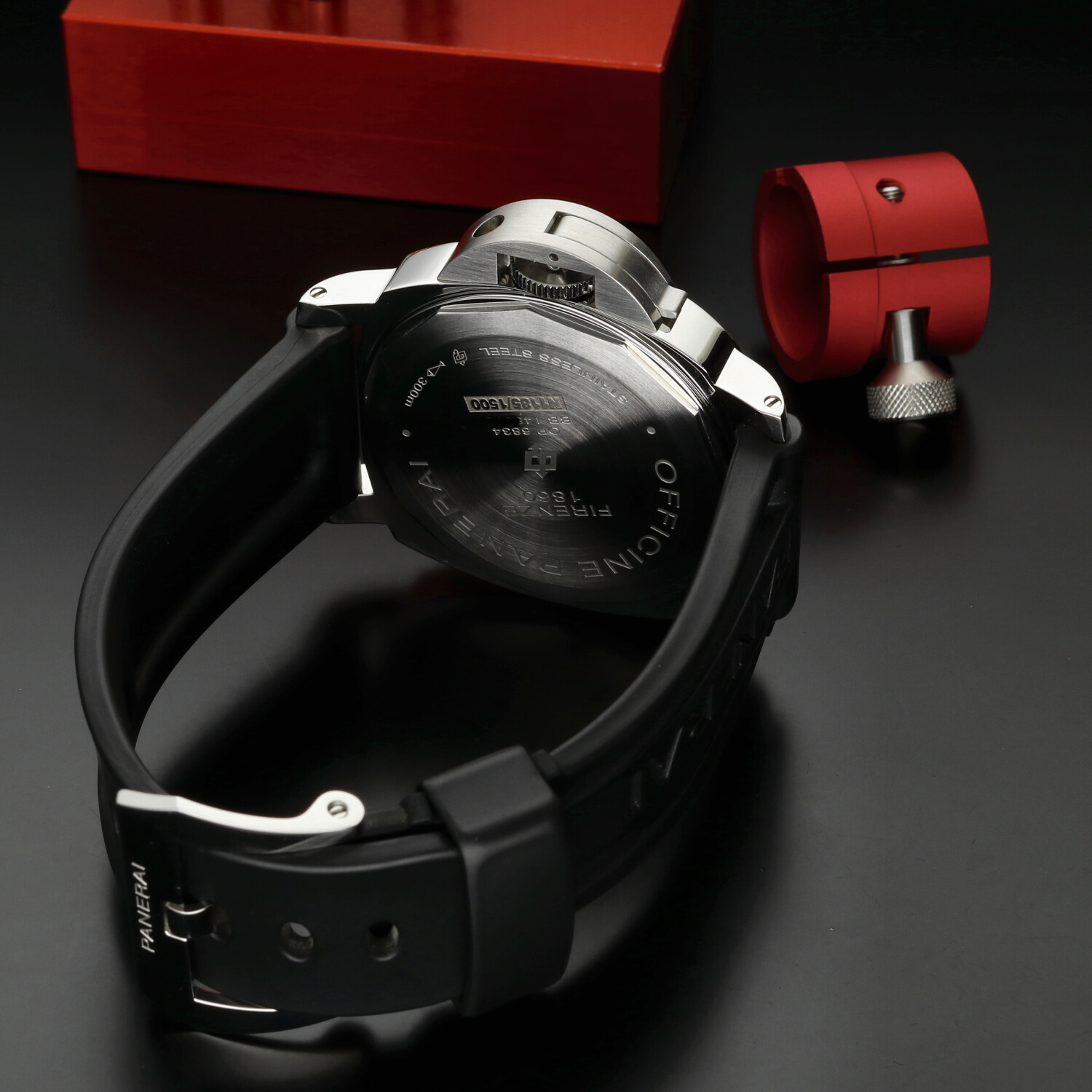 Cassa: La cassa Luminor in acciaio inossidabile da 44 mm si presenta in eccellenti condizioni di conservazione. Le anse mantengono uno spessore pieno e bordi ancora ben definiti. Eventuali micro hairlines, visibili solamente con lente di ingrandimento, risultano del tutto trascurabili. Il fondello pieno è coerente con lo stato generale dell’orologio e presenta incisioni profonde, nitide e perfettamente leggibili.