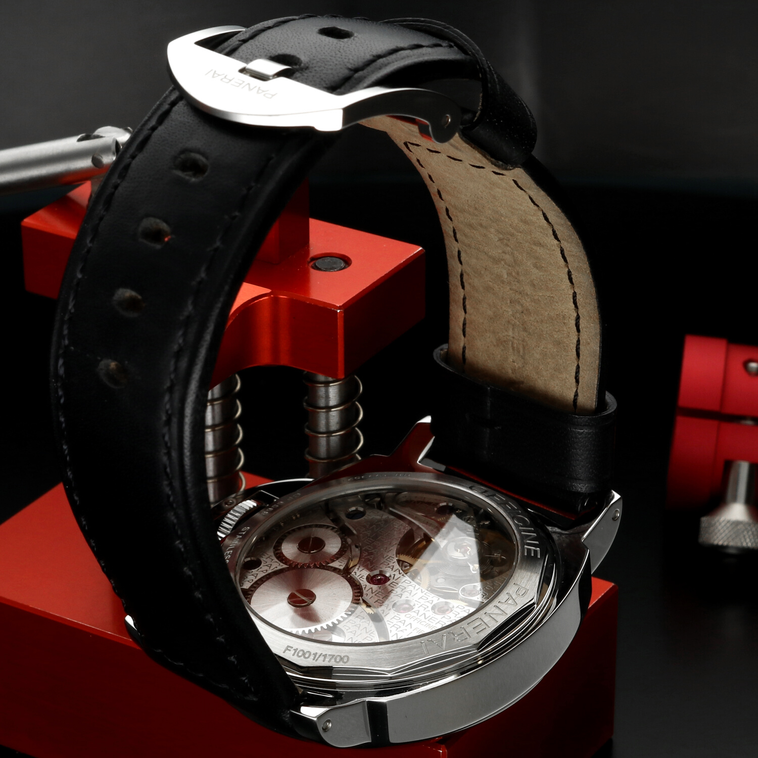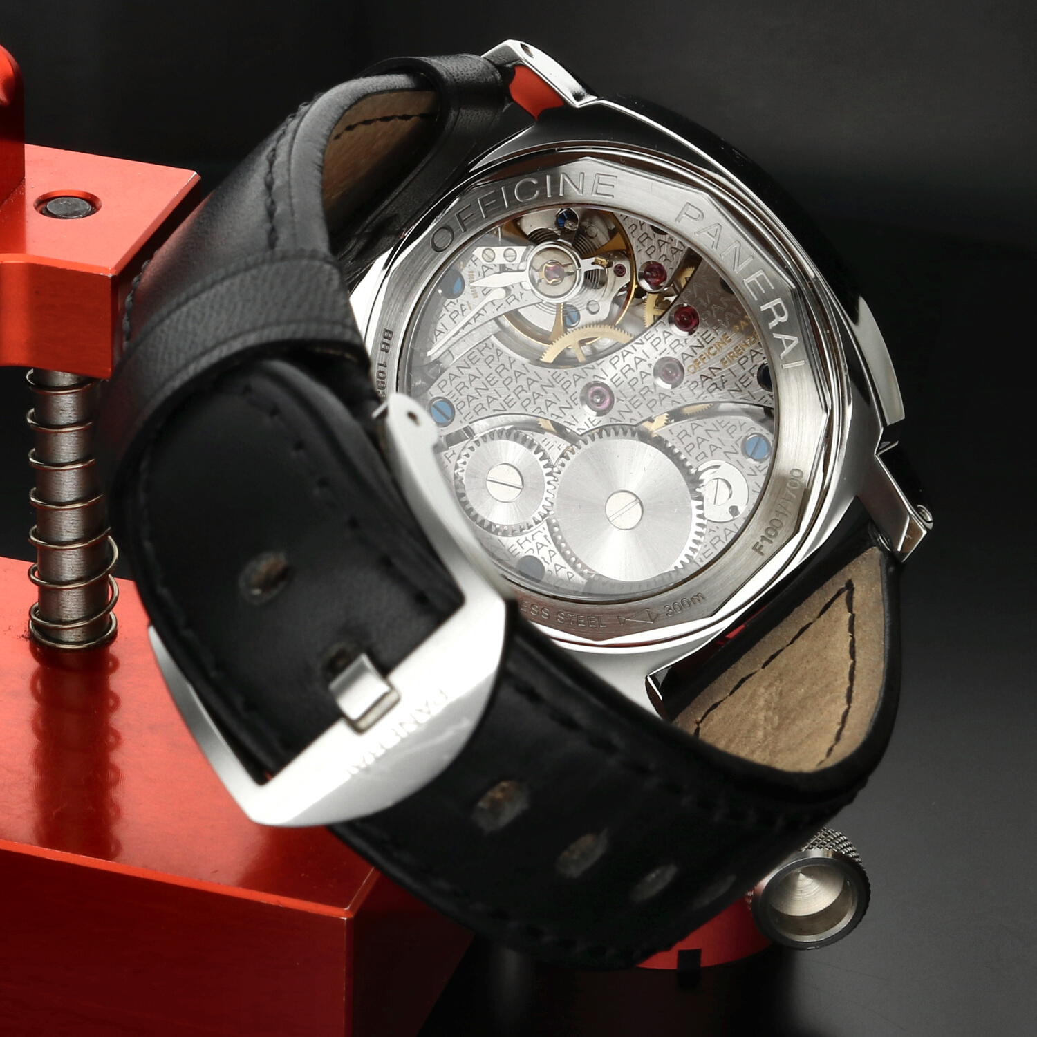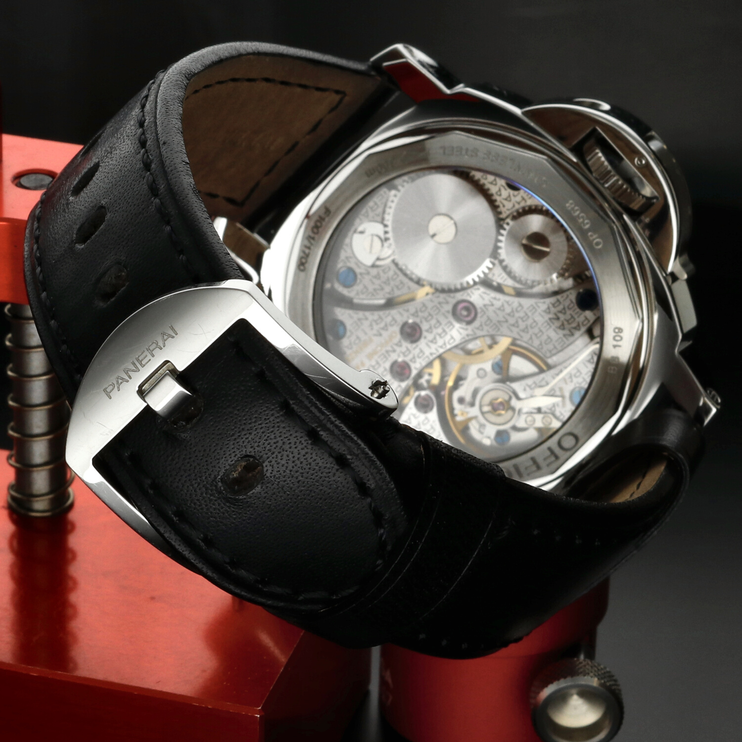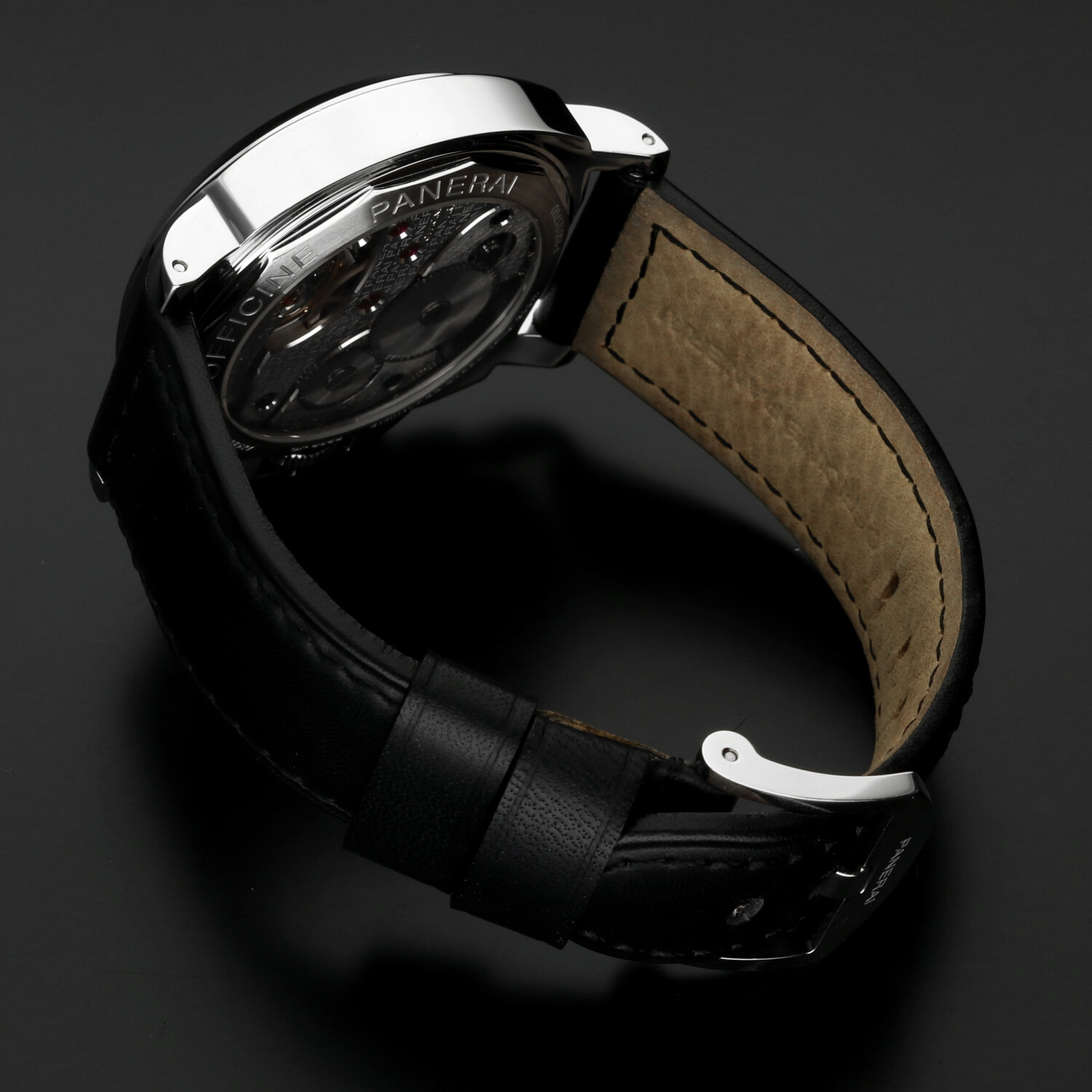 Il fondello trasparente consente di ammirare il calibro manuale OP X, derivato dal celebre ETA Unitas 6497, rifinito e personalizzato secondo gli standard Panerai. Un movimento robusto, affidabile e coerente con la filosofia meccanica del marchio.