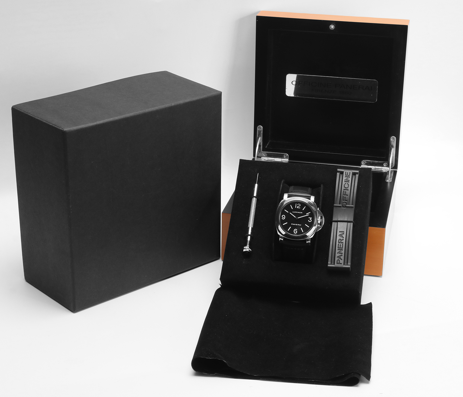 L’orologio è accompagnato dalla scatola interna originale in legno, dalla contro-scatola esterna in cartone, dal cinturino di ricambio in gomma e dal cacciavite originale Panerai. Non sono presenti libretti e garanzia originale.