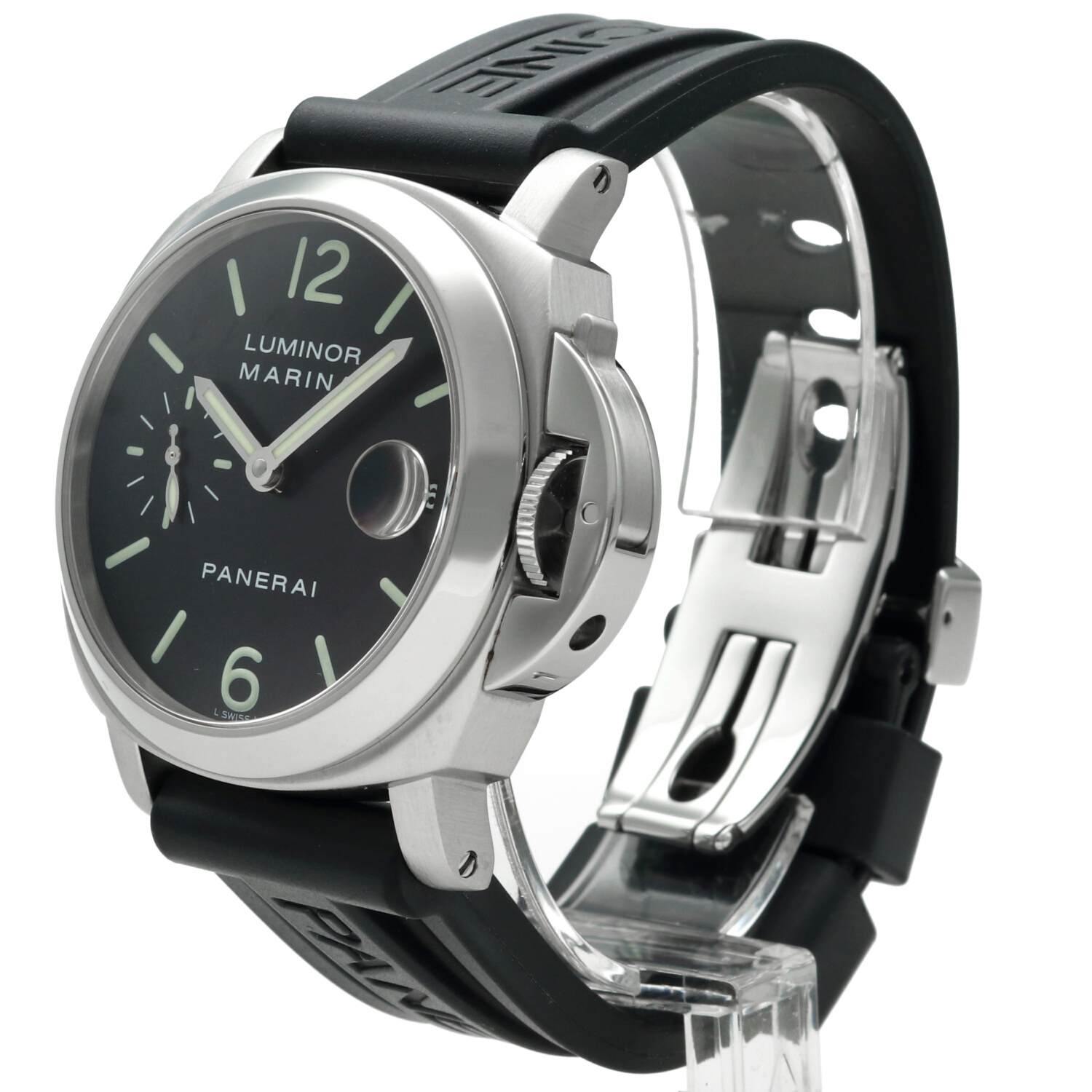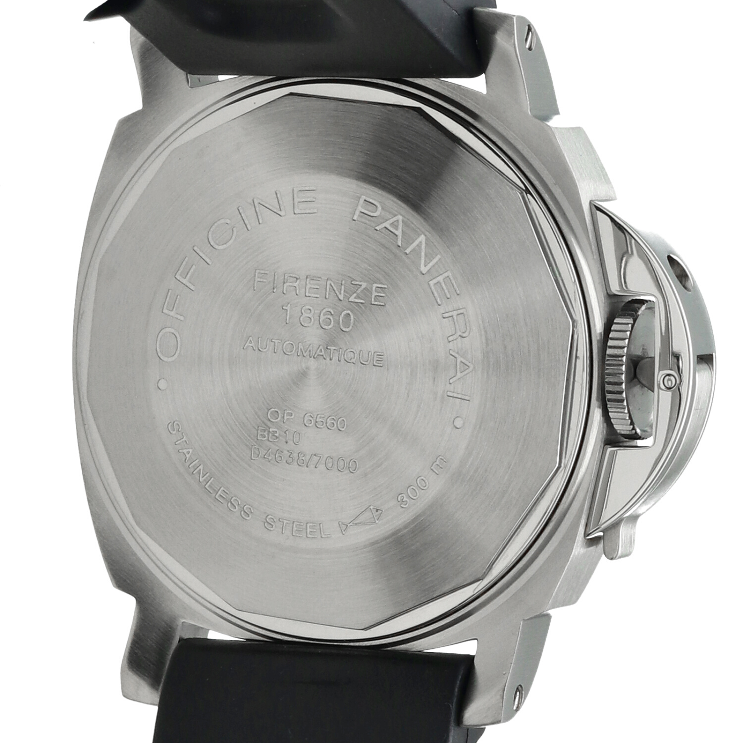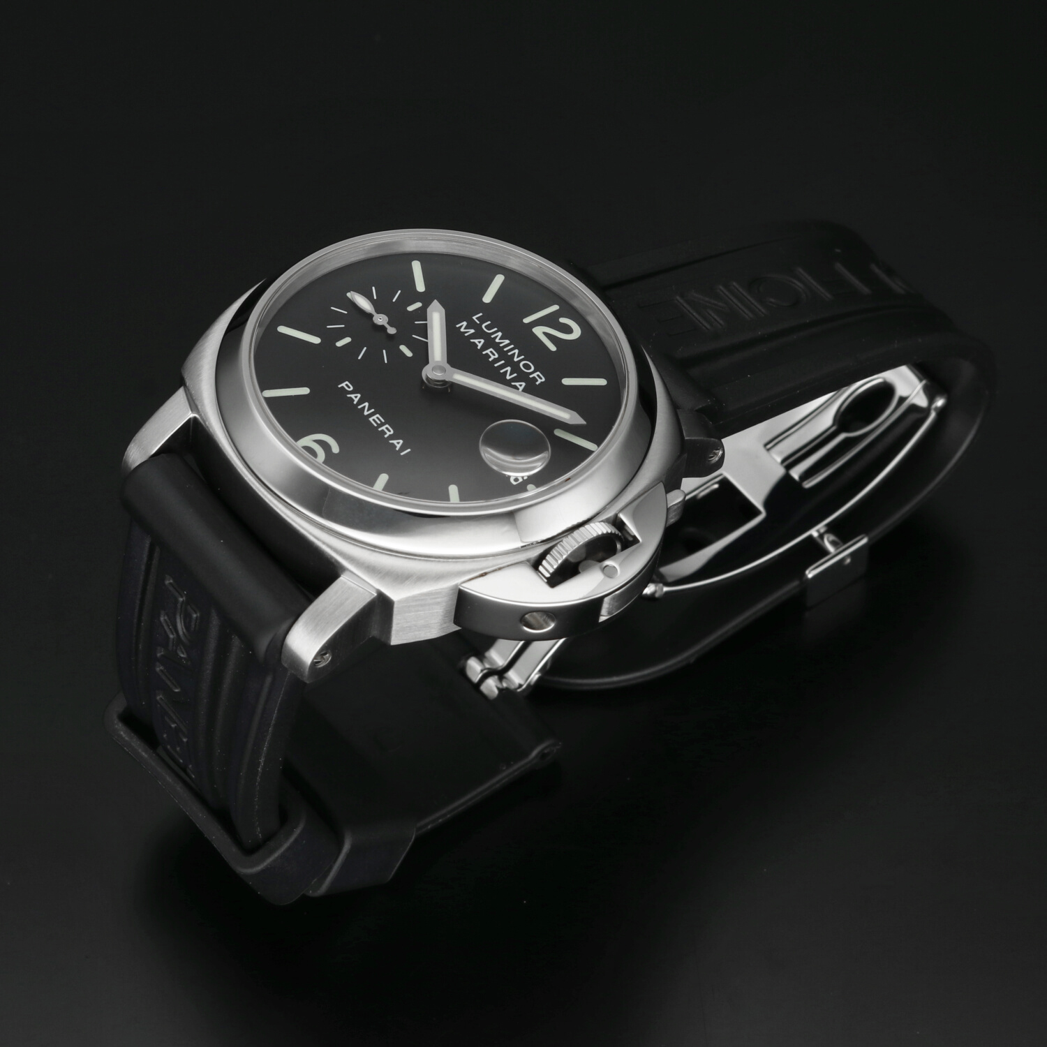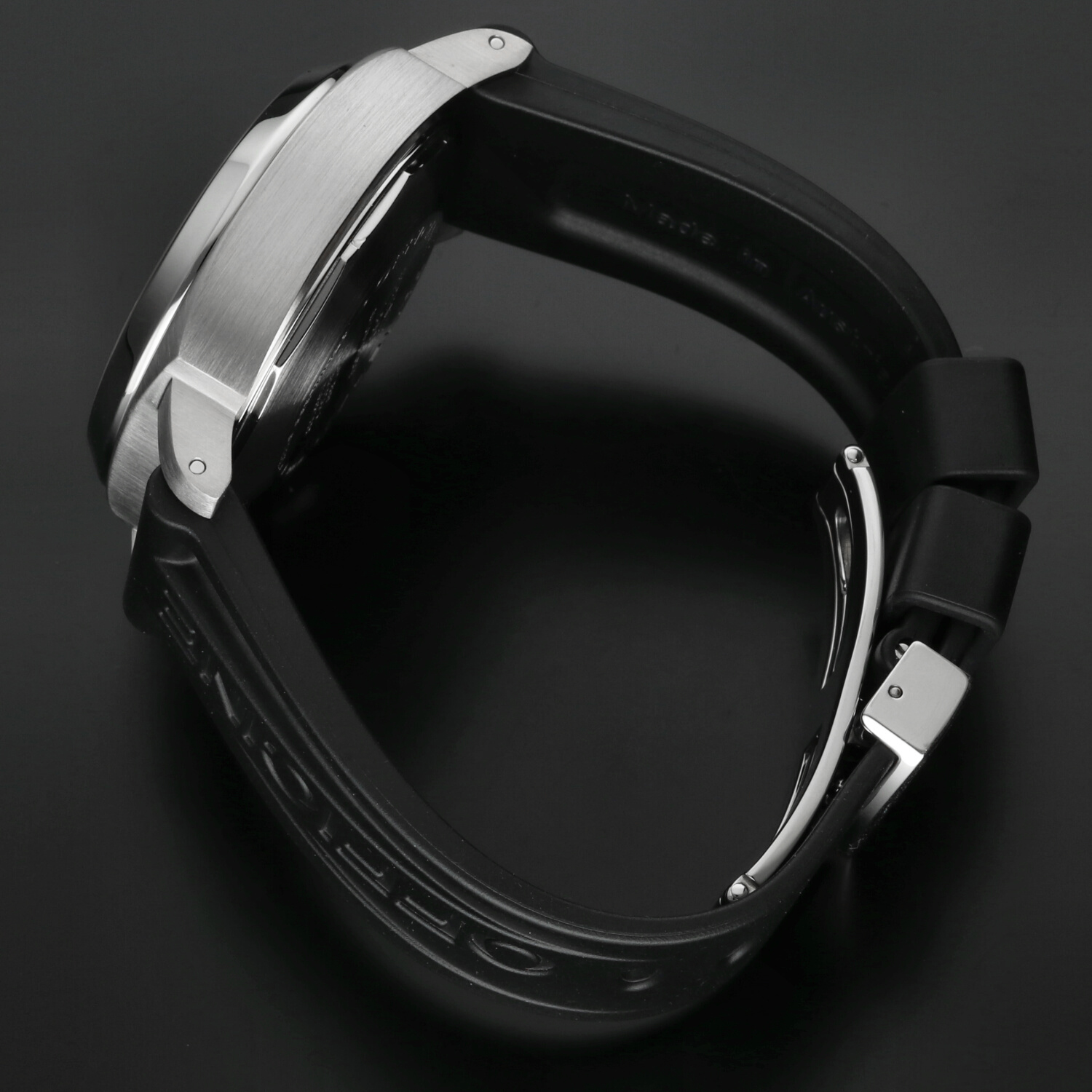 Cinturino: Il cinturino originale Panerai in caucciù è ottimamente conservato e non presenta segni di usura degni di nota. La chiusura deployante in acciaio si trova in ottime condizioni, con lievi hairlines superficiali non percepibili al tatto e difficilmente visibili a occhio nudo.