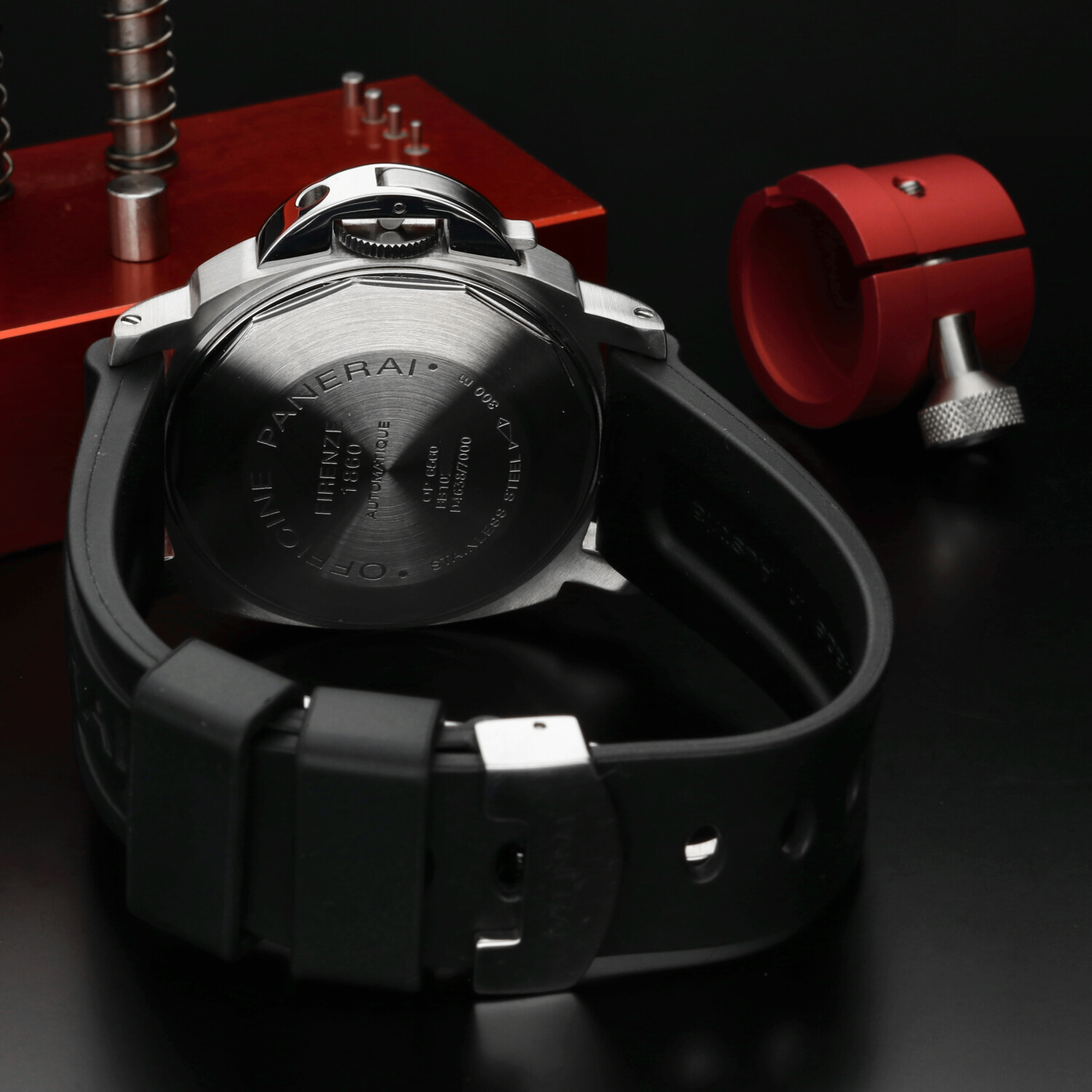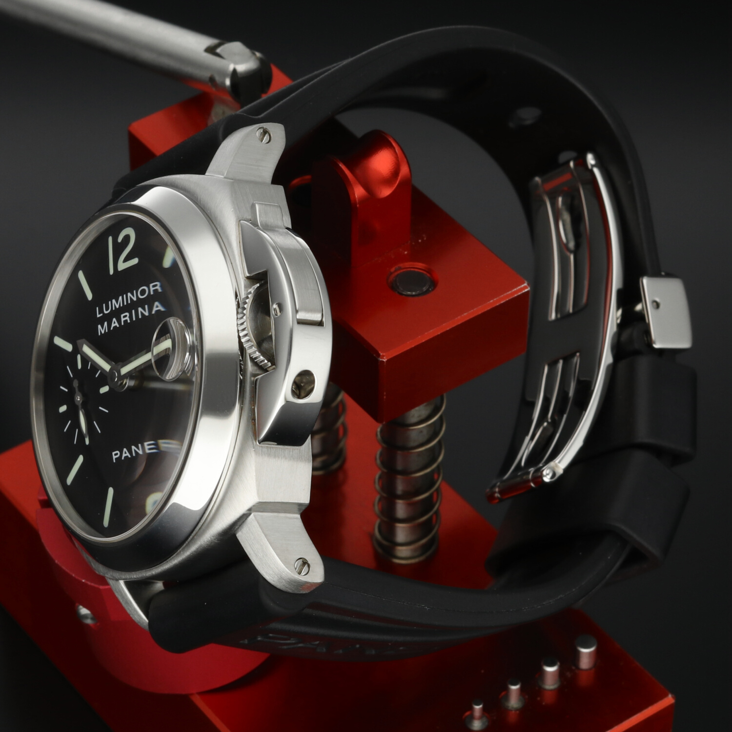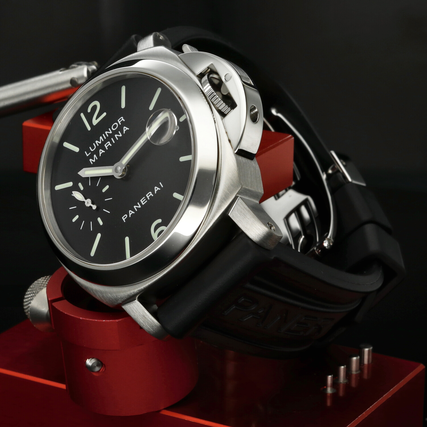 Cinturino: Il cinturino originale Panerai in caucciù è ottimamente conservato e non presenta segni di usura degni di nota. La chiusura deployante in acciaio si trova in ottime condizioni, con lievi hairlines superficiali non percepibili al tatto e difficilmente visibili a occhio nudo.