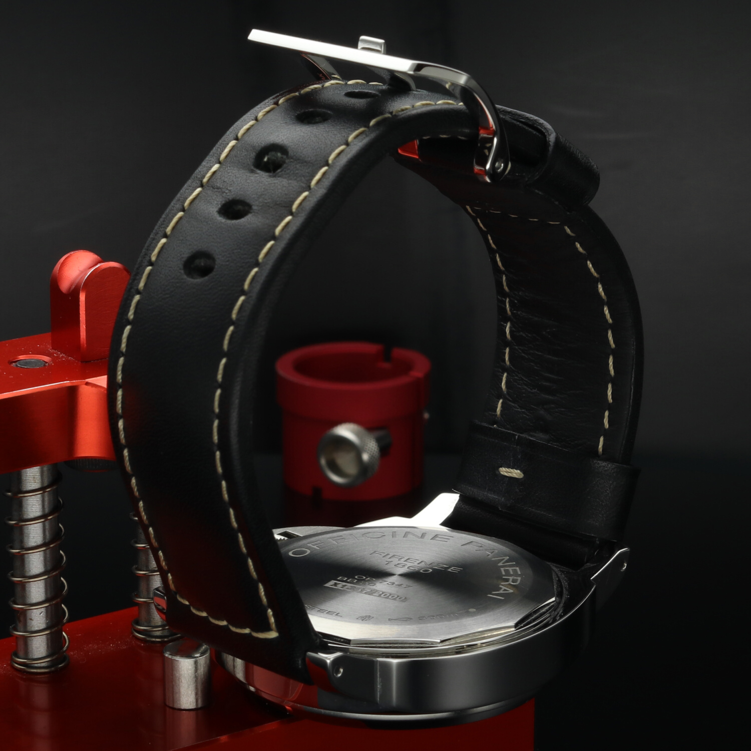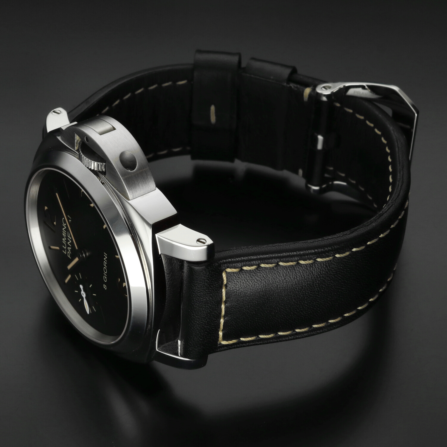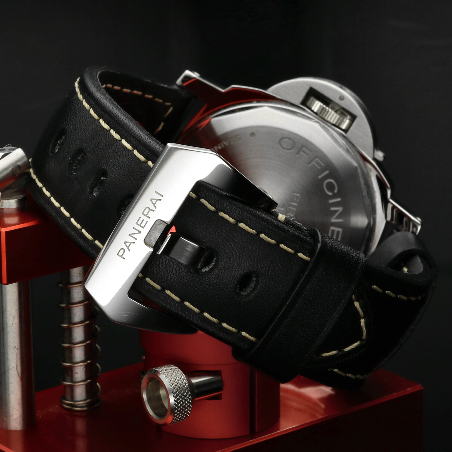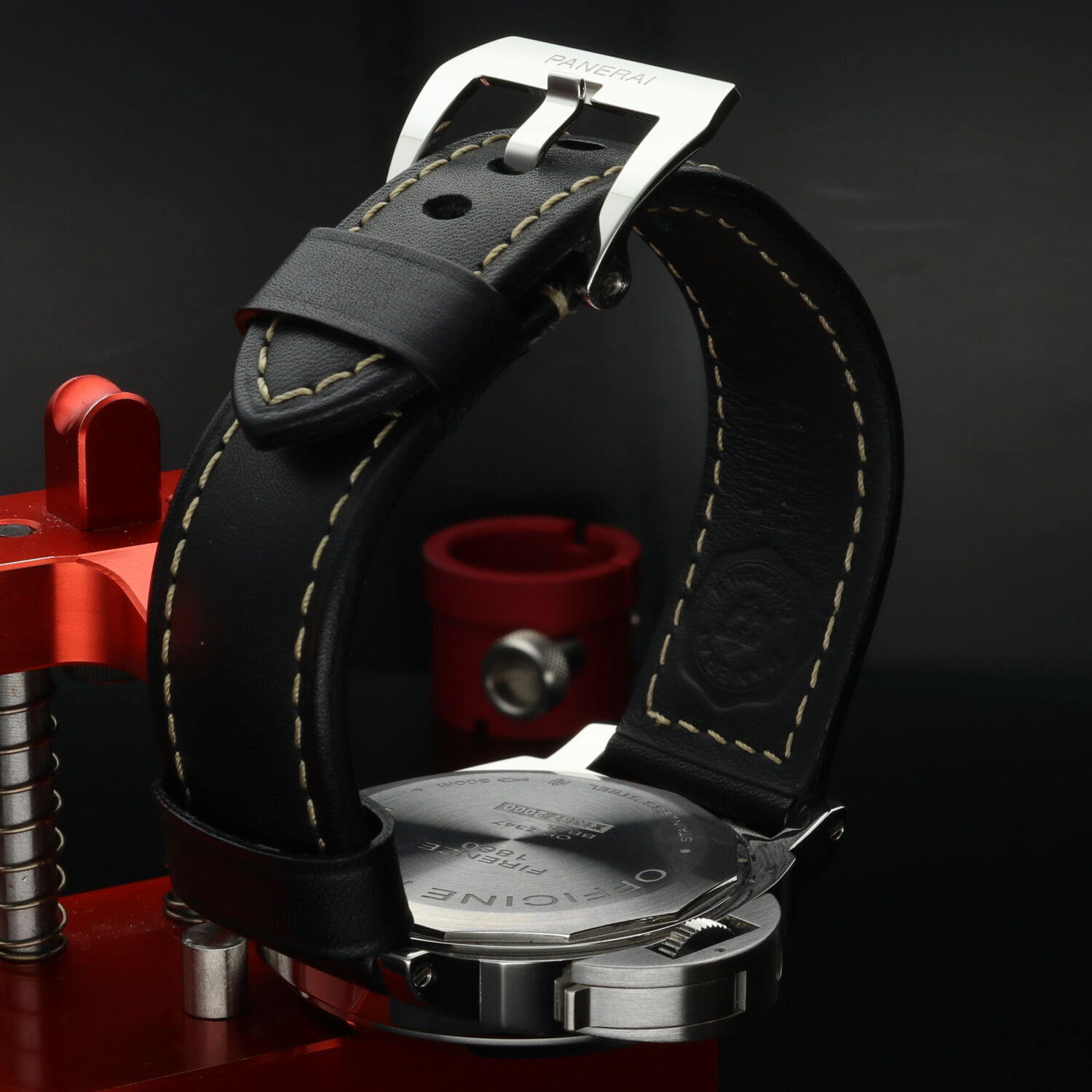 Cinturino: Il cinturino originale Panerai in pelle nera si presenta anch’esso in condizioni eccellenti, pari al nuovo. Sono visibili soltanto lievi pieghe nella zona di chiusura, naturali segni dovuti alla regolazione sulla fibbia. La fibbia ad ardiglione in acciaio, logata Panerai, presenta impercettibili micro linee visibili esclusivamente con lente di ingrandimento.