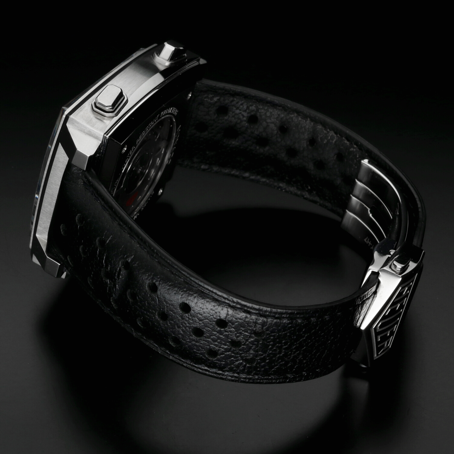 Cinturino: Il cinturino in pelle nera traforata, autentica firma racing della collezione Monaco, si presenta in ottime condizioni generali. Sulla parte esterna e su quella interna sono visibili le normali pieghe dovute alla chiusura, che hanno leggermente segnato la pelle nella porzione finale del cinturino. Trattandosi della parte più distante dalla cassa, queste pieghe rientrano all’interno della fibbia deployante una volta indossato l’orologio e risultano quindi praticamente invisibili al polso. La fibbia deployante in acciaio si presenta in condizioni eccellenti, con segni di utilizzo minimi.