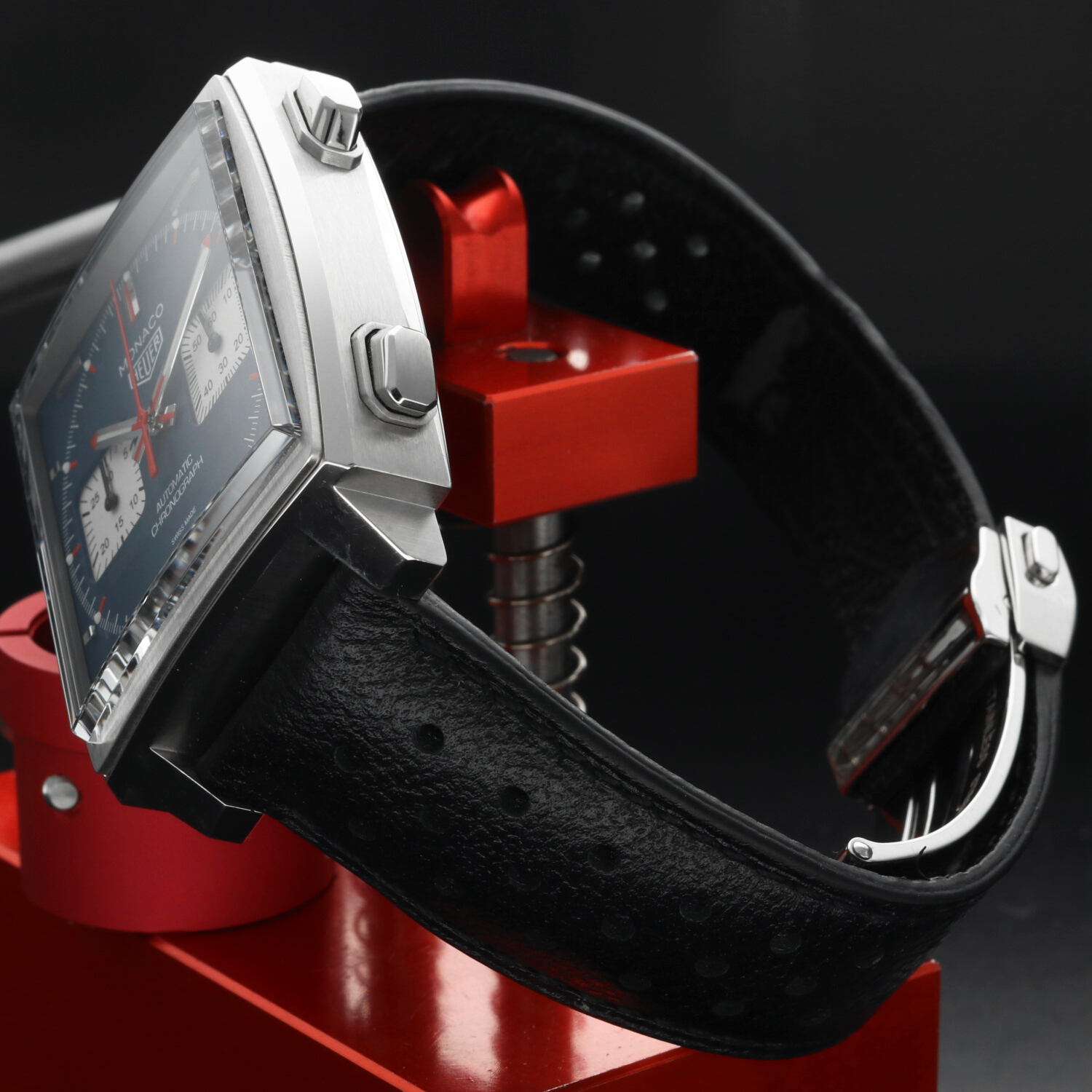 Il quadrante blu petrolio, cuore pulsante di questo Monaco, è perfettamente conservato: indici applicati, lancette e contatori bianchi/argentati mantengono una freschezza impeccabile, garantendo un’eccellente leggibilità unita al fascino sportivo iconico del modello.