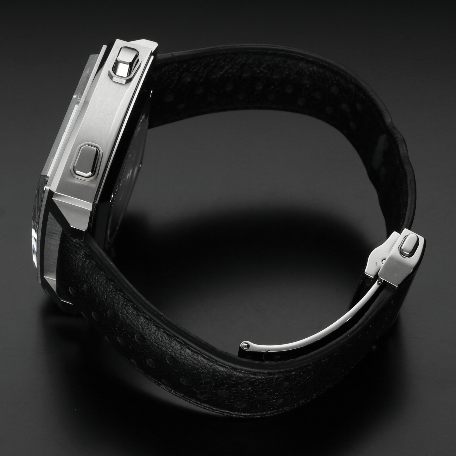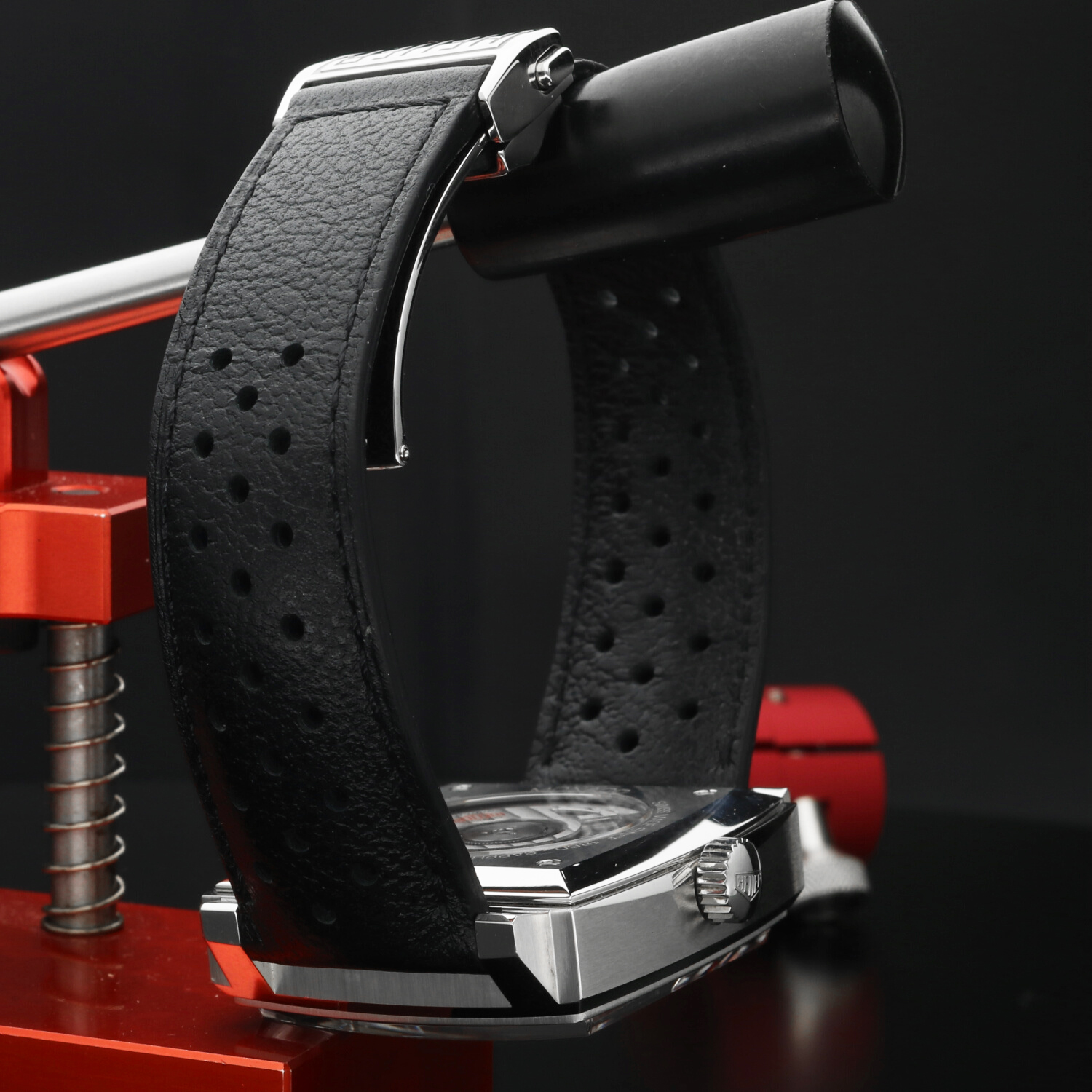 Il cinturino in pelle nera traforata, emblema dello spirito racing della collezione e sanificato con prodotti professionali, si presenta in ottime condizioni: nella parte esterna sono visibili esclusivamente le pieghe naturali dovute alla chiusura; nella parte interna, sempre in corrispondenza delle pieghe, sono presenti segni di usura leggermente visibili. La fibbia deployante in acciaio è in condizioni eccellenti, con minima o assente usura visibile.